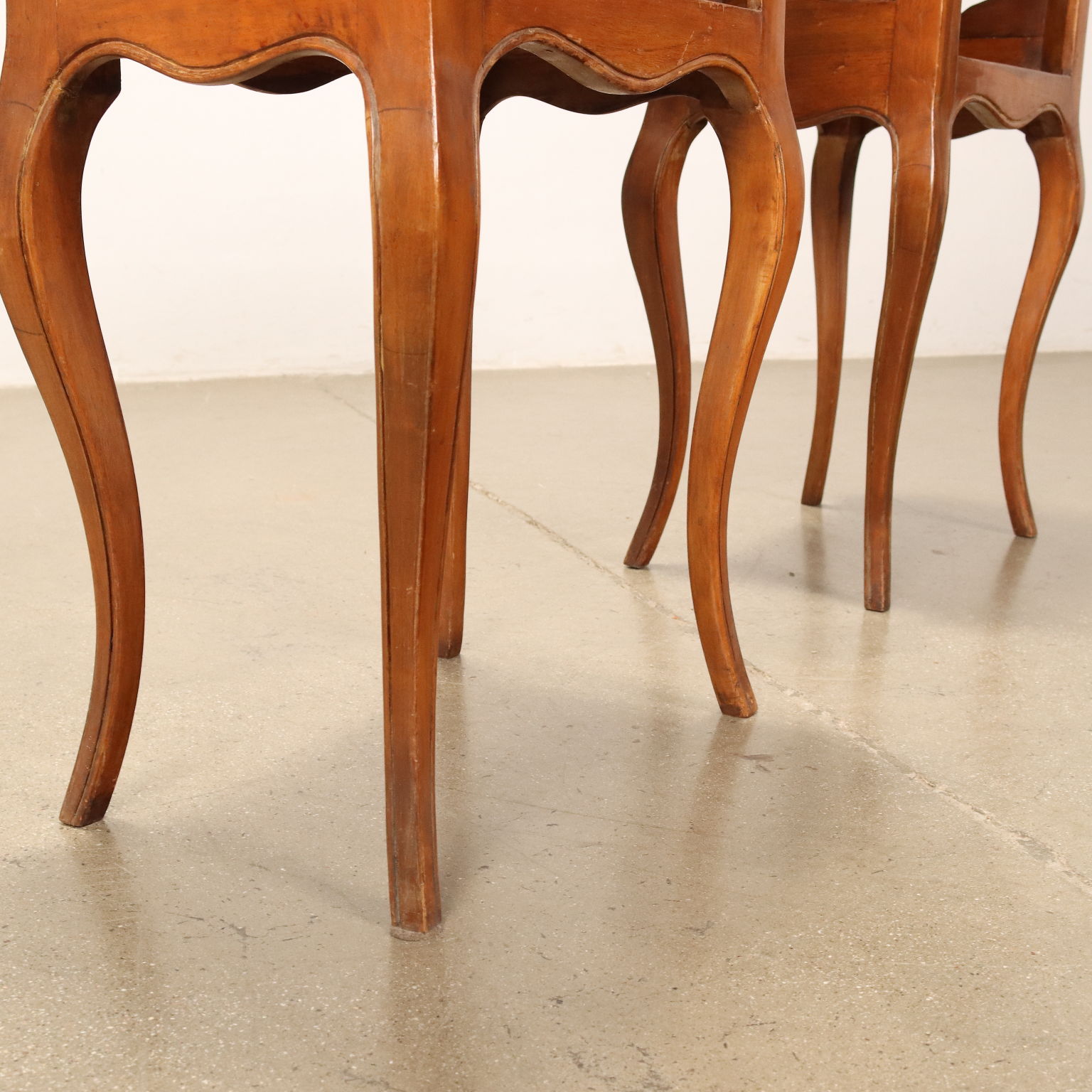 Coppia di comodini in stile con piano incorniciato da ringhierina mossa, sotto piano vano a giorno decorato da fori intagliati nei fianchi e gambe mosse e bordate in mogano con intaglio. Italia XX secolo