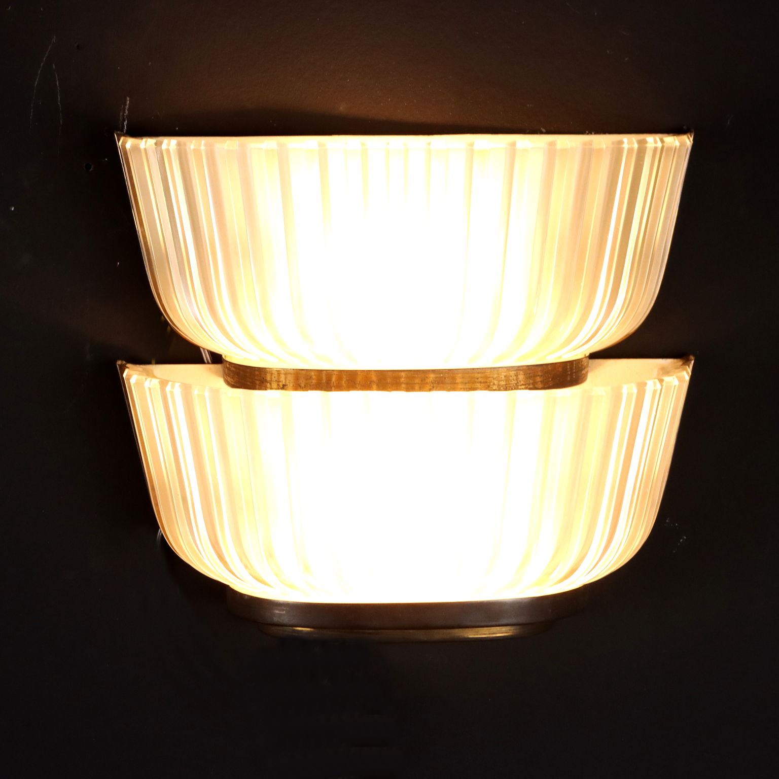 Gruppo di 3 lampade a parete in ottone, metallo e vetro.