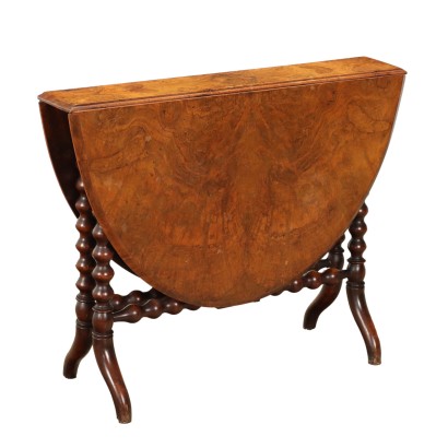 Tavolino con piano ovale in radica di noce apribile grazie a delle bandelle laterali sostenute da due delle quattro gambe tornite raccordate da traversa con quadrato centrale che ne permette lo spostamento. Inghilterra XX secolo.
