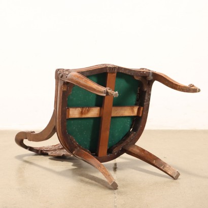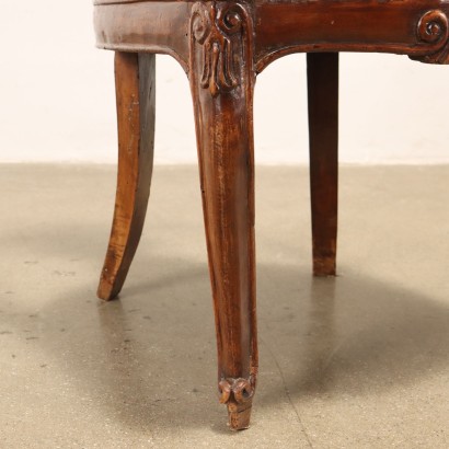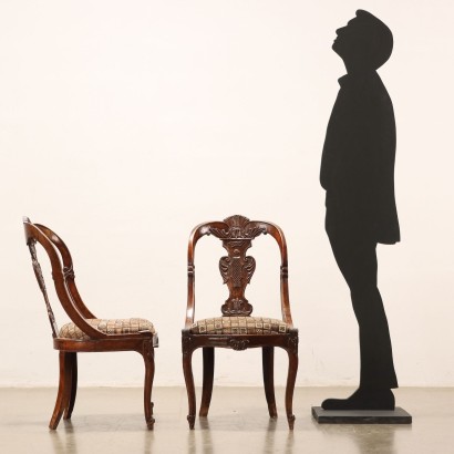 Gruppo di quattro sedie in noce con schienale a giorno costituito da cartella centrale riccamente intagliata e decorata con motivi a ricciolo e intaglio a triage. Intagli presenti anche sui montanti, sulla fascia sottoseduta e sulle gambe con piedini a ricciolo. Restauri. Genova secondo quarto XIX secolo