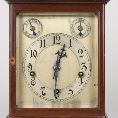 Orologio da tavolo con suoneria in legno e vetri bisellati. Movimento e meccanismo a vista. Mostra con ore a numeri arabi. Completo di chiavi di carica.