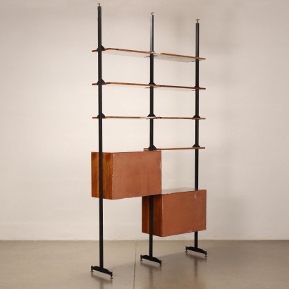 Libreria in legno impiallacciato mogano con ripiani ed elementi contenitori a posizione regolabile con montanti in metallo smaltato e piedini in ottone.