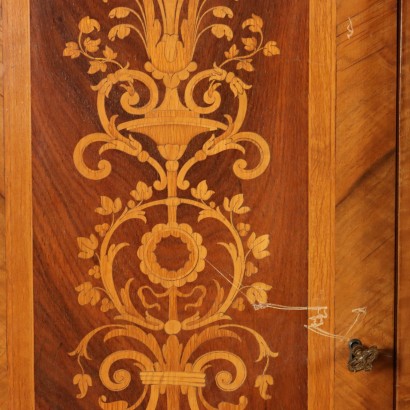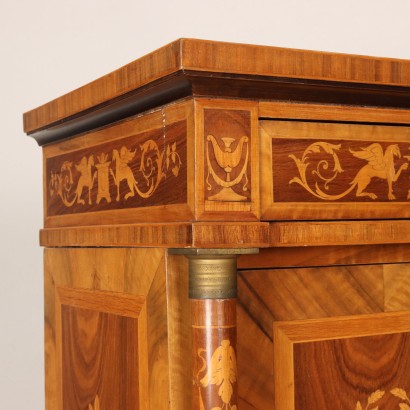 Grande credenza con fronte recante tre cassettini nella fascia superiore, due ante laterali incorniciate da quattro colonne con capitelli bronzei che le separano dal corpo centrale composto da anta a ribalta e tre cassetti sottostanti. Tutta la struttura è riccamente intarsiata e al centro presenta scena mitologica raffigurante Venere circondata da putti. Italia XX secolo