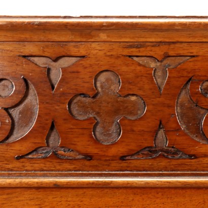 Fioriera neogotica a giorno in noce con piano recante vano porta fiori con vasca in ottone. Fronte con fascia sottopiano riccamente intagliata, quattro vani a giorno decorati con trifore e separati a due a due da lesene decorate con semicolonne tortili con capitelli intagliati. Fianchi decorati con intaglio entro cartelle. Italia prima metà XIX secolo