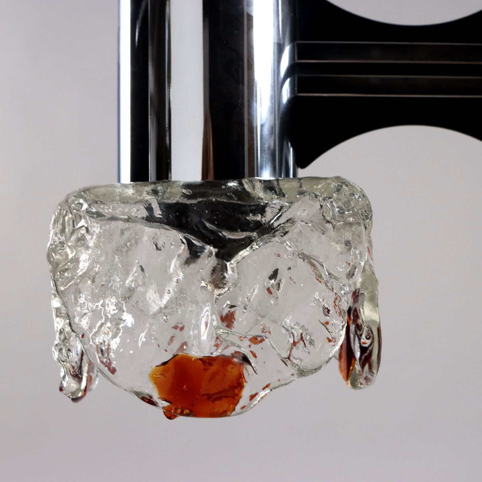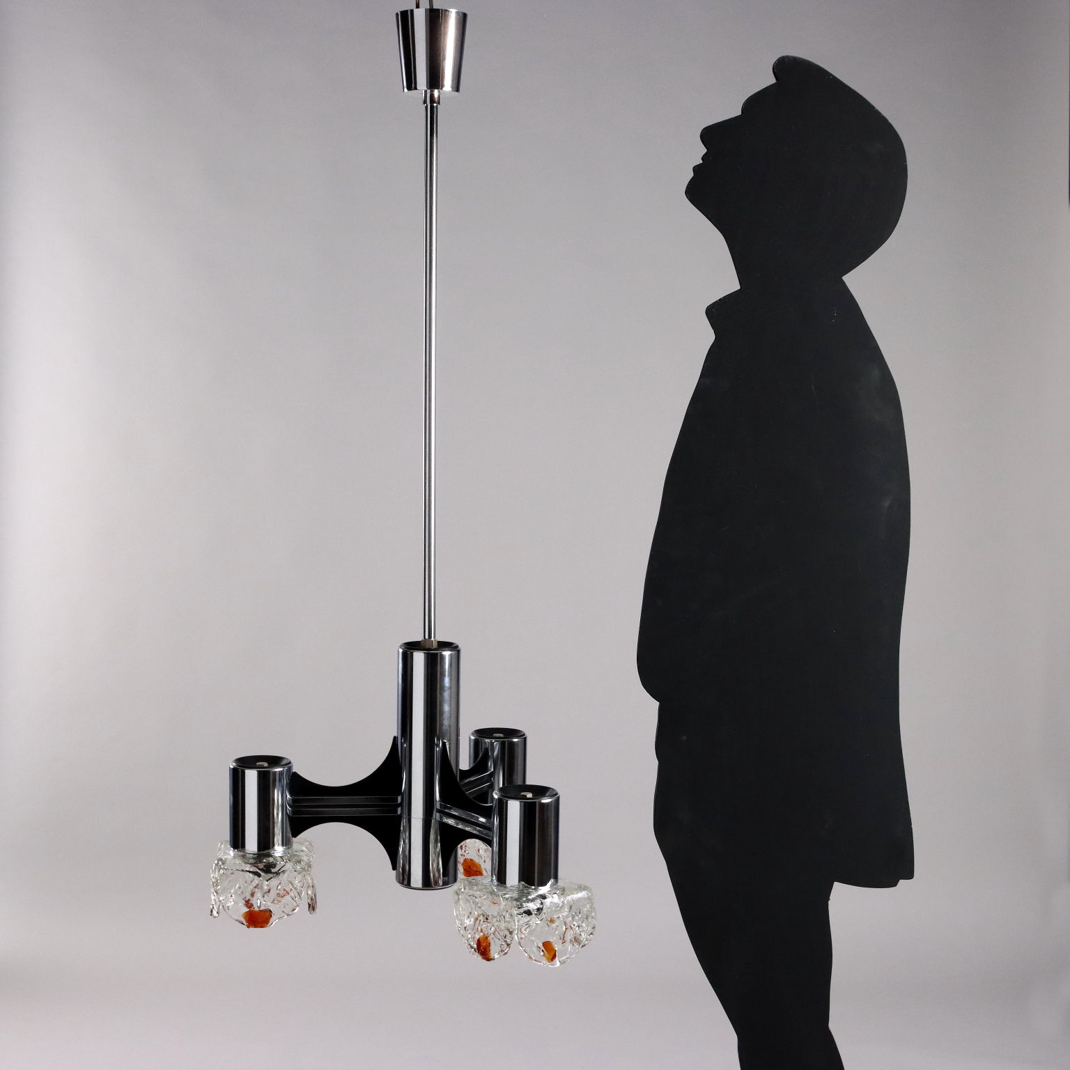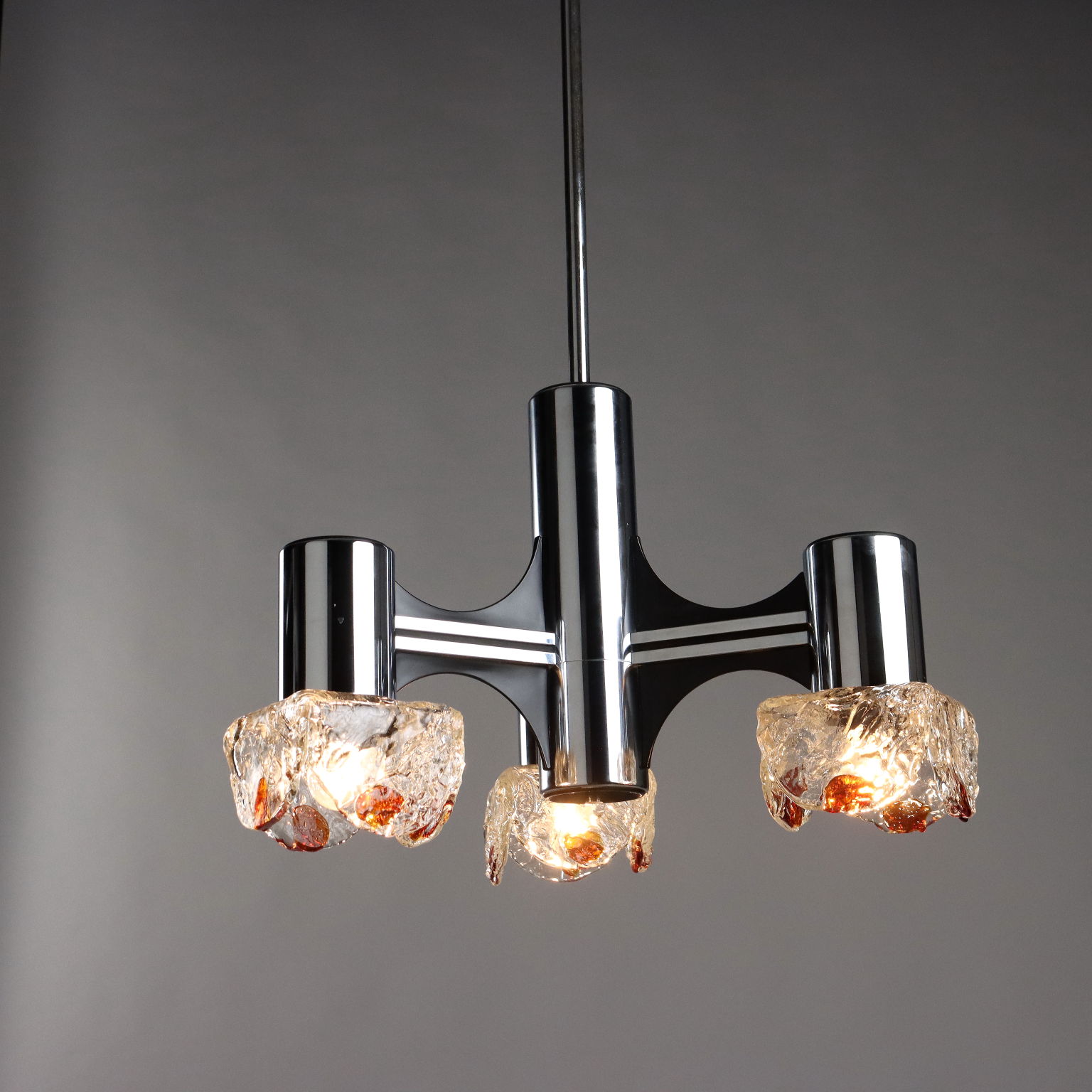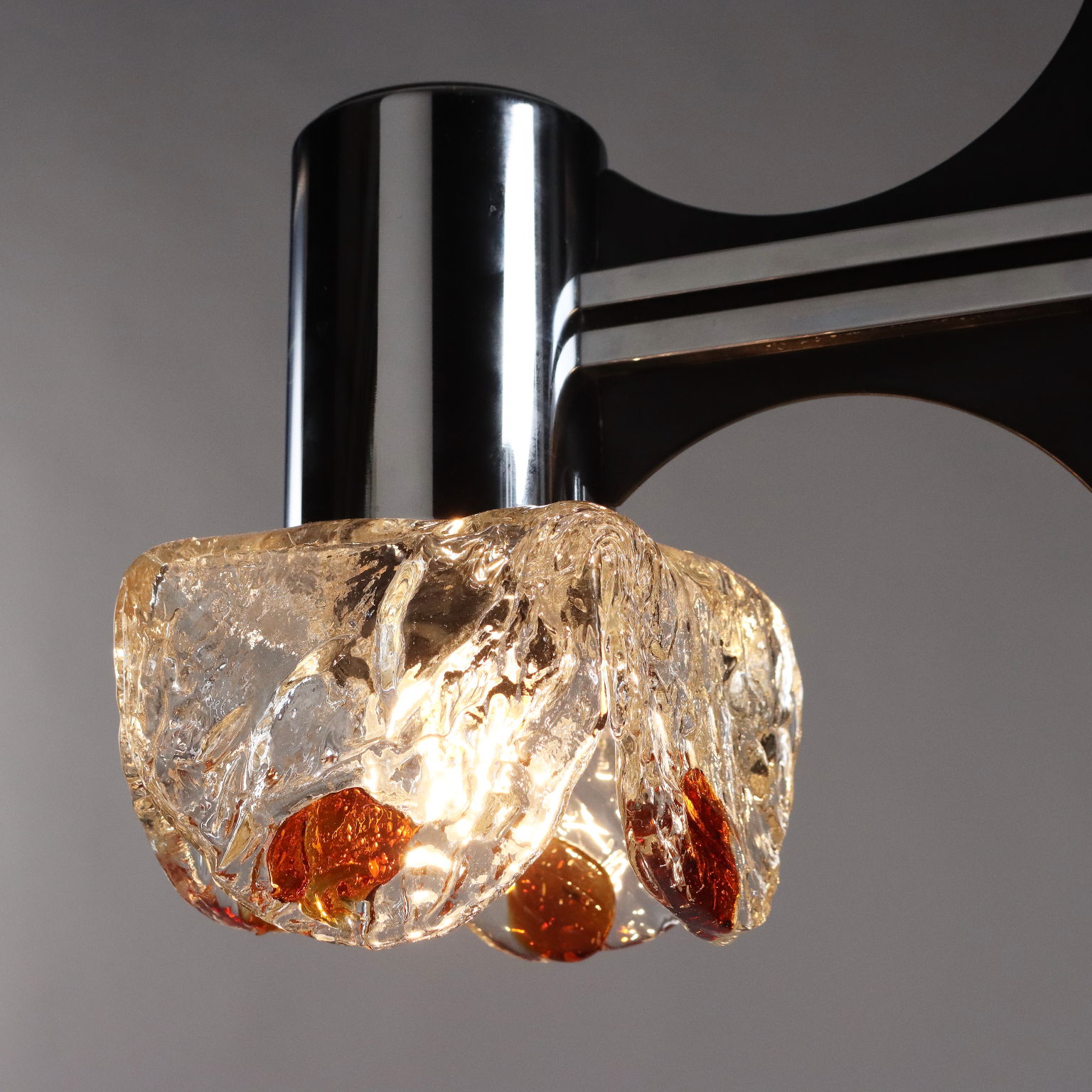 Lampada a soffitto in alluminio cromato e smaltato con diffusori in vetro soffiato; originale lampada dallo stile inconfondibile a 3 punti luce, ideale come punto luce centrale per un ambiente Living che vuole richiamare lo stile innovativo degli anni 70.