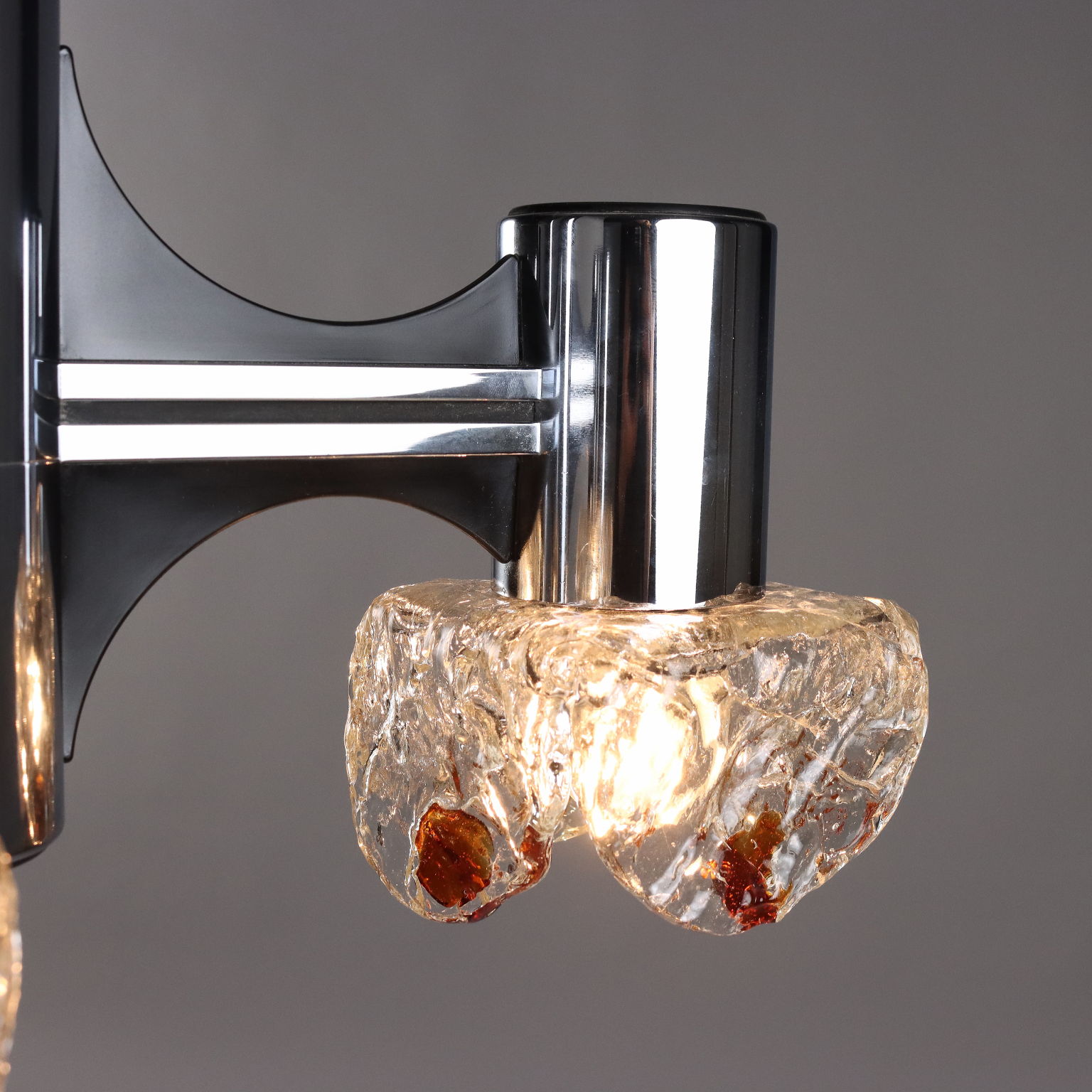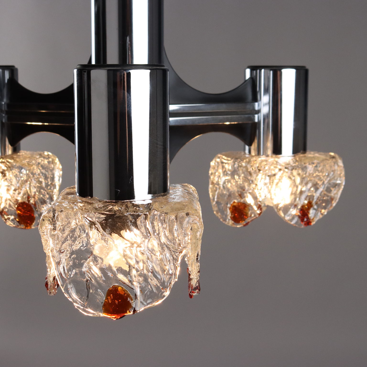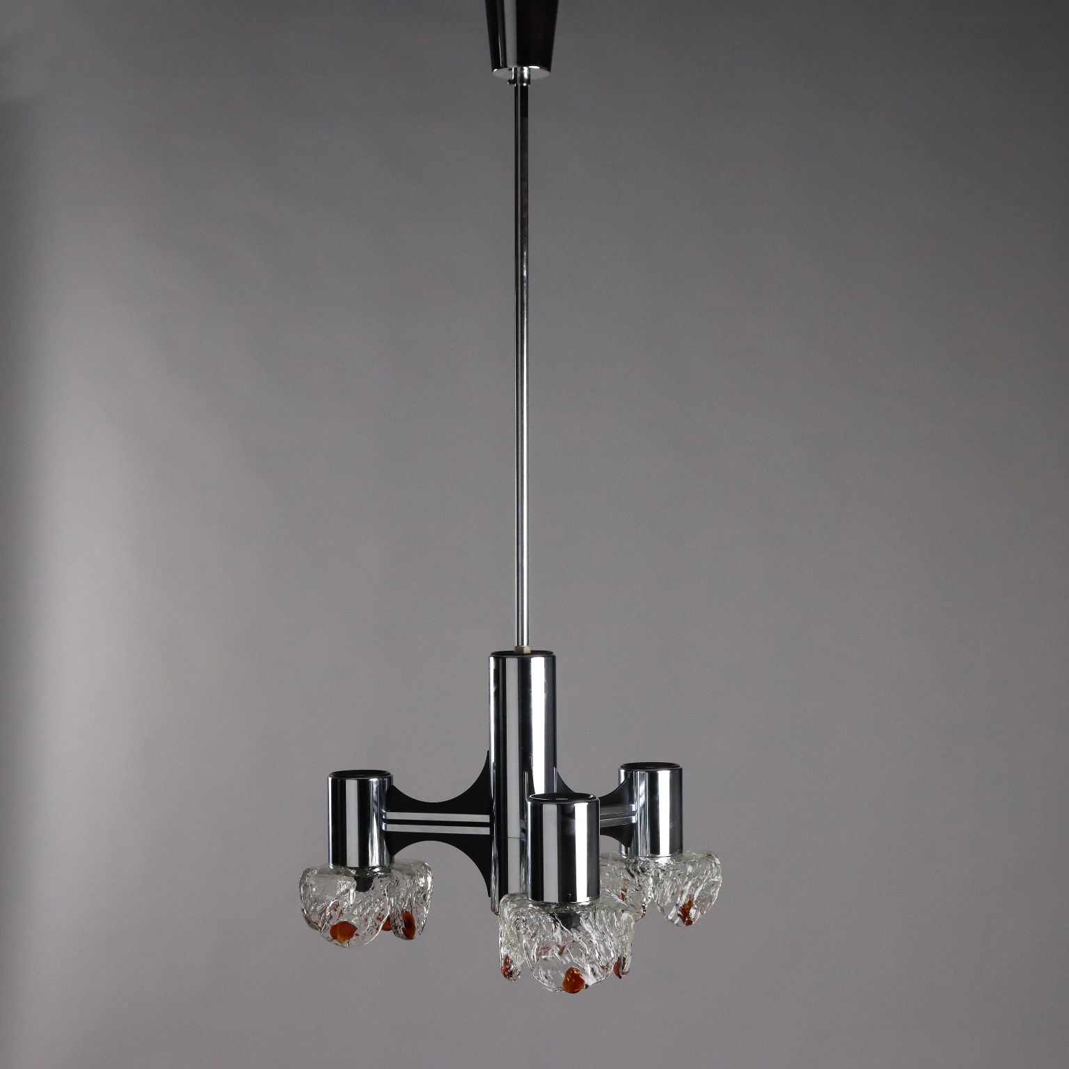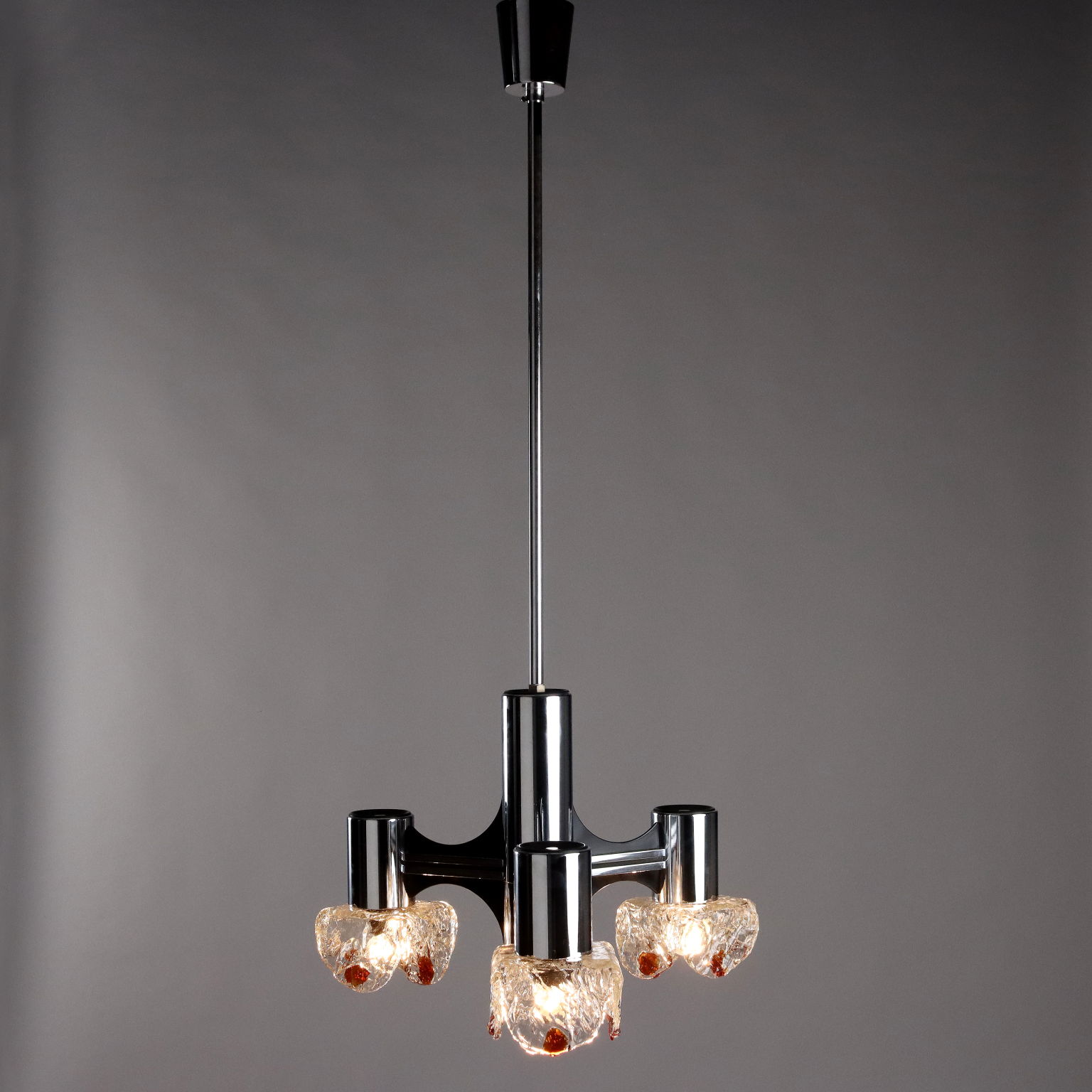 Lampada a soffitto in alluminio cromato e smaltato con diffusori in vetro soffiato; originale lampada dallo stile inconfondibile a 3 punti luce, ideale come punto luce centrale per un ambiente Living che vuole richiamare lo stile innovativo degli anni 70.