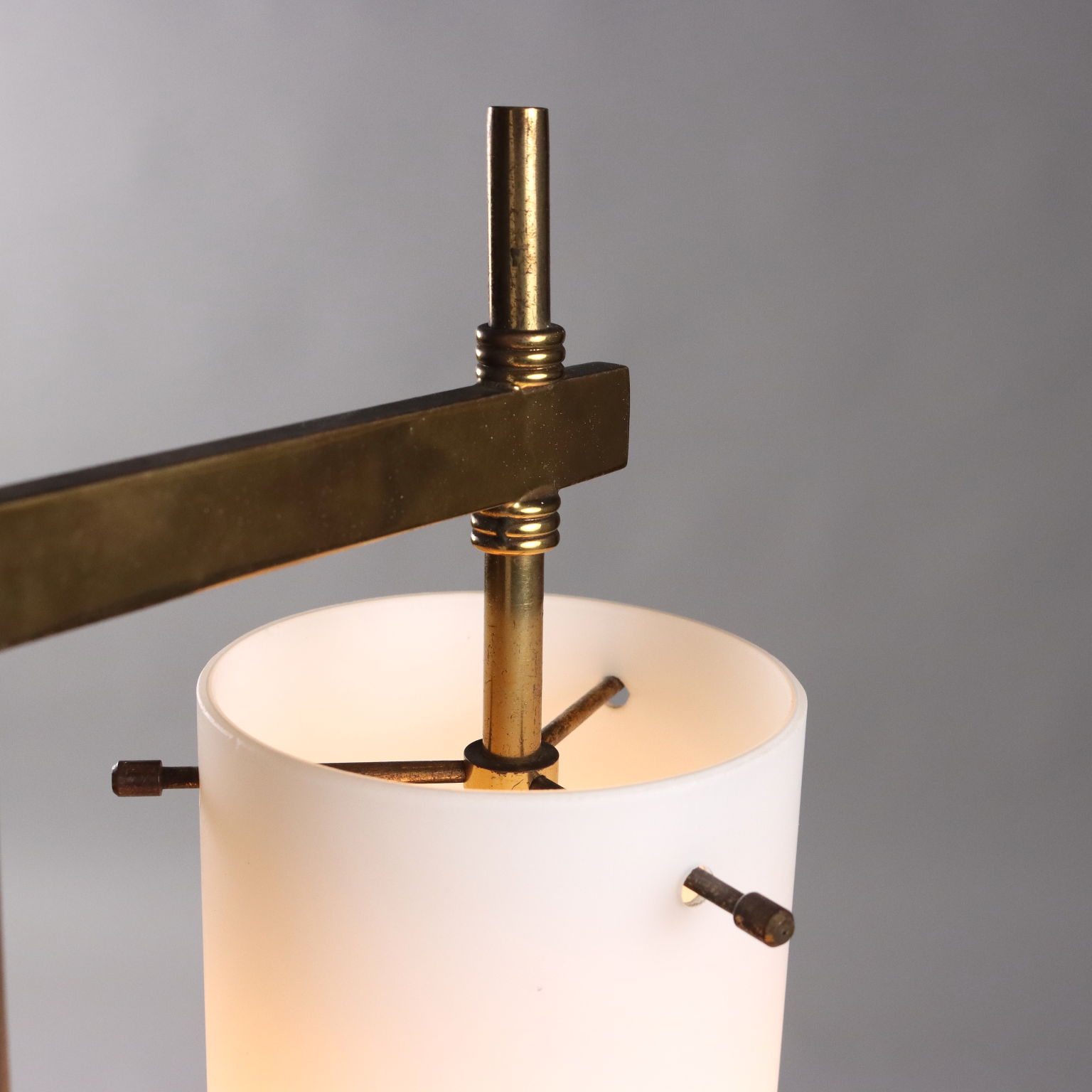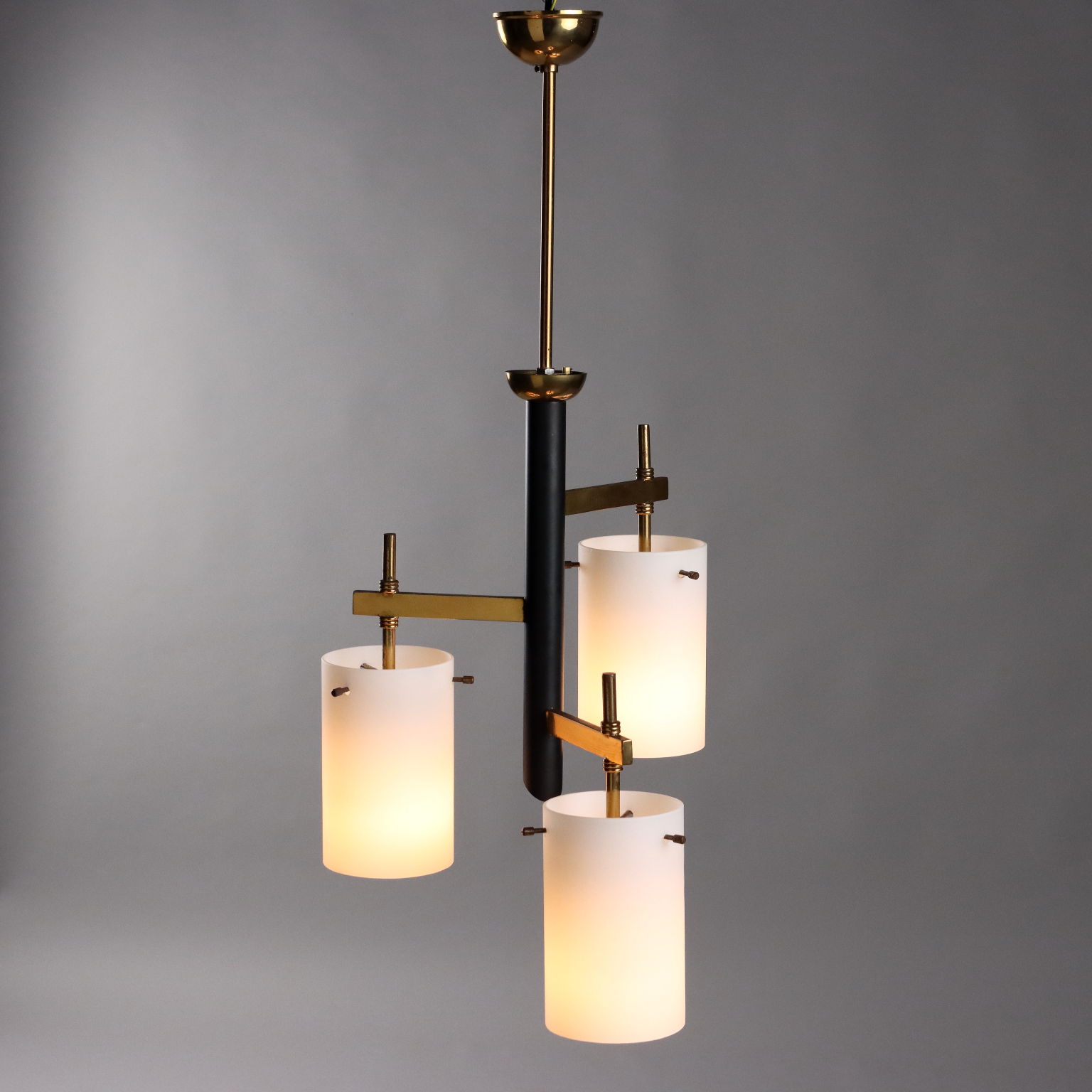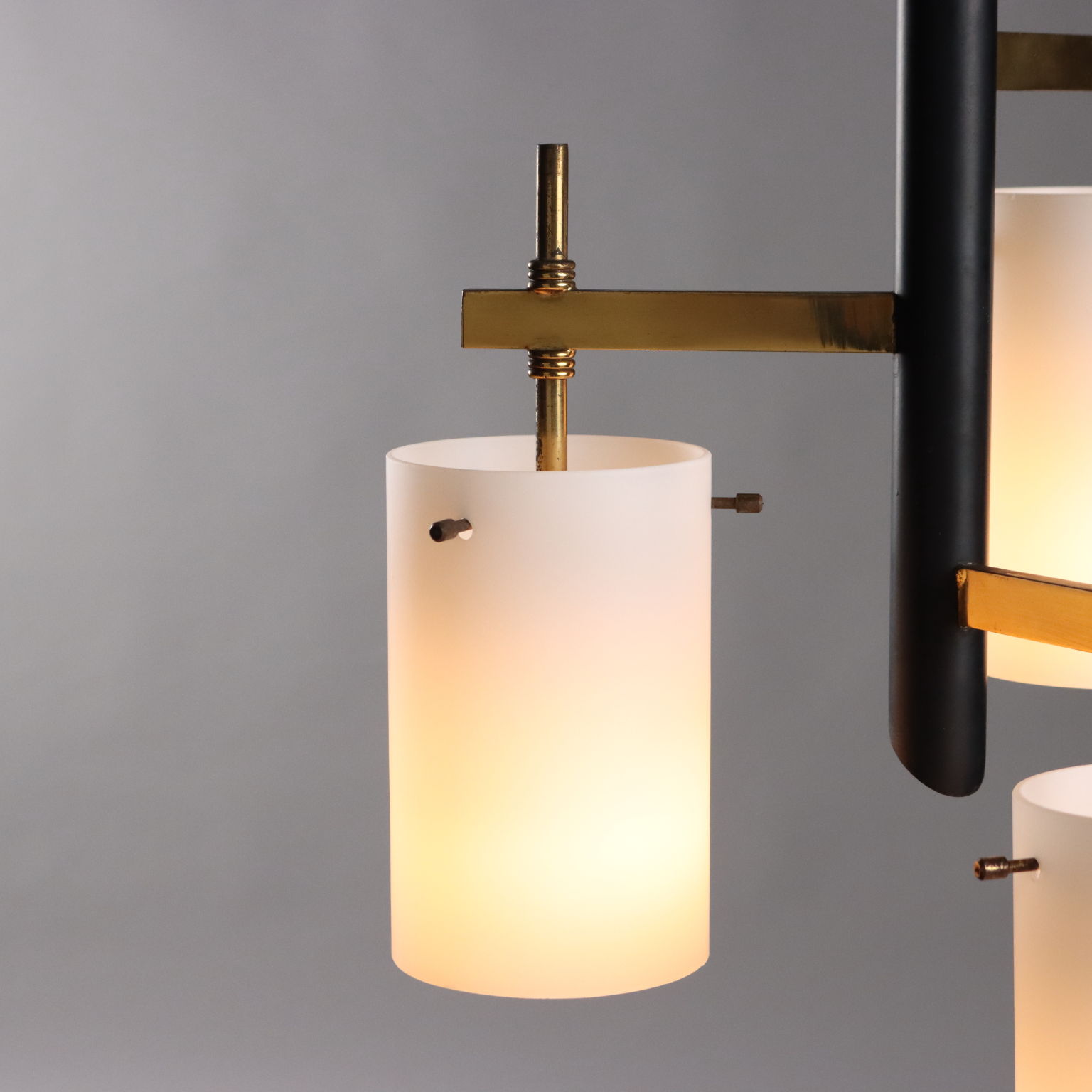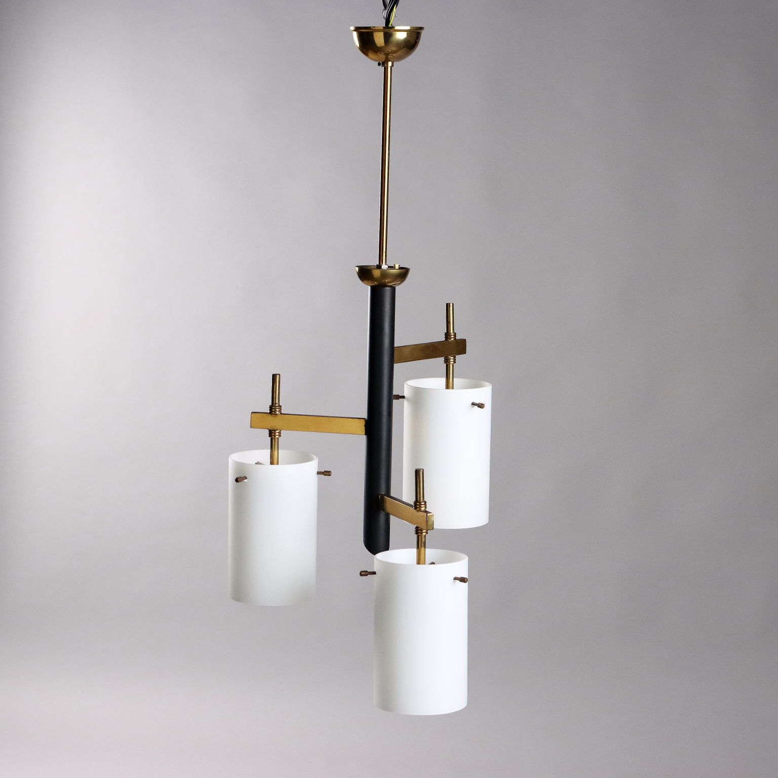 Lampada a soffitto in metallo smaltato e ottone con diffusori in vetro opalino.