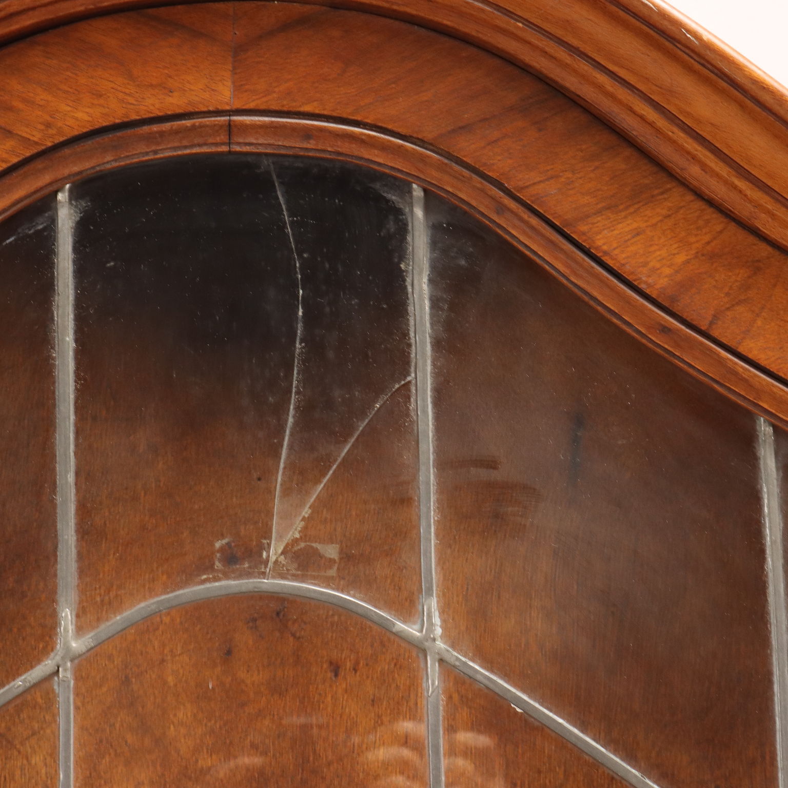 Piccola cassettiera con alzata con cimasa mossa, vetrina impiallacciata in noce e radica di noce e vetri a piombo, montanti a 45 gradi. Fronte a due cassetti intarsiati con acero a formare riccioli e radica di noce. Gambe mosse e intagliate con motivi fitomorfi. Italia XX secolo