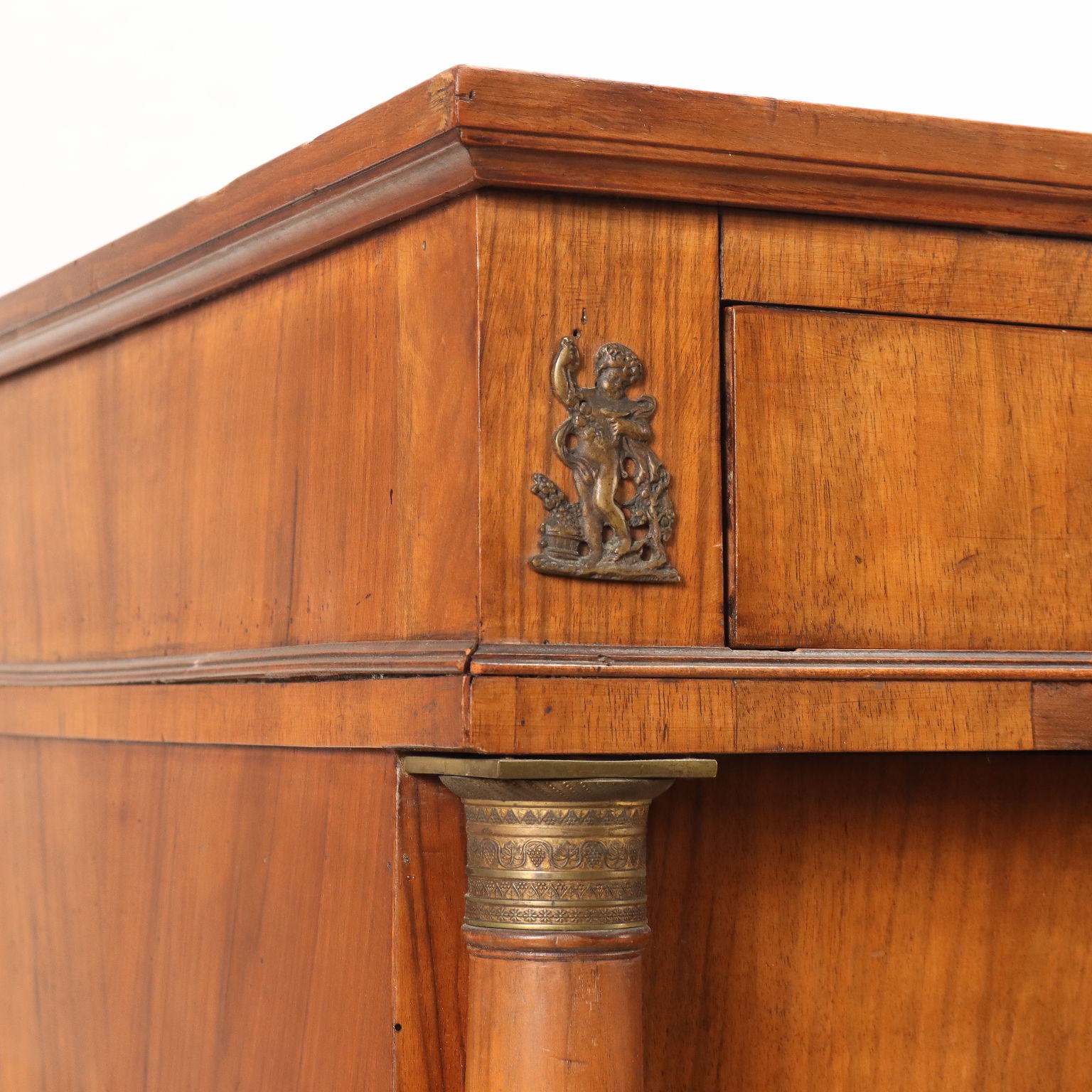 Piccolo cassettone con fronte a quattro cassetti di cui il più piccolo situato nella fascia sotto piano, decorato con maniglie bronzee raffiguranti teste di leone e recante bronzetti decorativi con amorini. I tre cassetti sottostanti presentano bocchette bronzee a forma di lira aggiunti successivamente. Montanti raffiguranti colonne con capitelli in bronzo. Impiallacciatura e interni in noce. Italia inizio XIX secolo