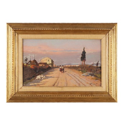 Olio su tavola. Firmato in basso a destra. Al retro presente a matita il titolo e una numerazione. Cafiero Filippelli, livornese e appartenente al Gruppo Labronico, si dedicò sia agli scorci interni molto intimisti, sia alla pittura di paesaggio, soprattutto quello della sua terra, spesso popolandola di figurine. In questo scorcio di una via della periferia livornese, attualmente molto più popolata di case, si rivela bene lo spirito intimista dell'artista, che con le suggestioni dei colori di un tramonto, accompagna la lenta camminata di una coppia di contadini, centrali. L'opera è presentata in cornice.
