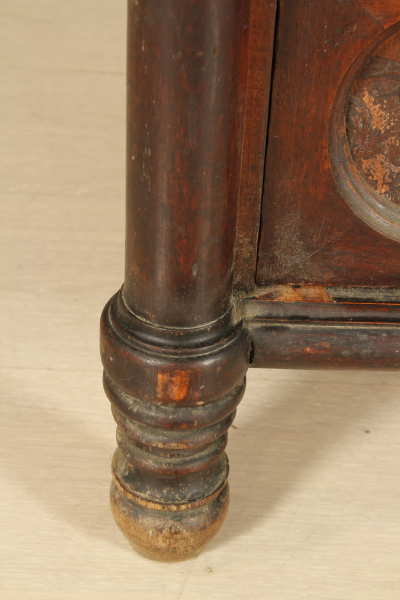 Cassettiera che sul fronte presenta sei cassetti, montanti in faggio torniti, i fianchi e i pannelli dei cassetti sono in compensato impresso . Arredo che rientra nelle tipologie dei mobili Kohn o Thonet di inizio secolo.