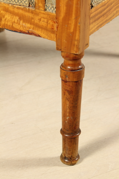 Coppia di bergere in mogano biondo con i piedi frontali torniti, braccioli imbottiti con presa con colonna staccata, filettature nelle cimase dello schienale.