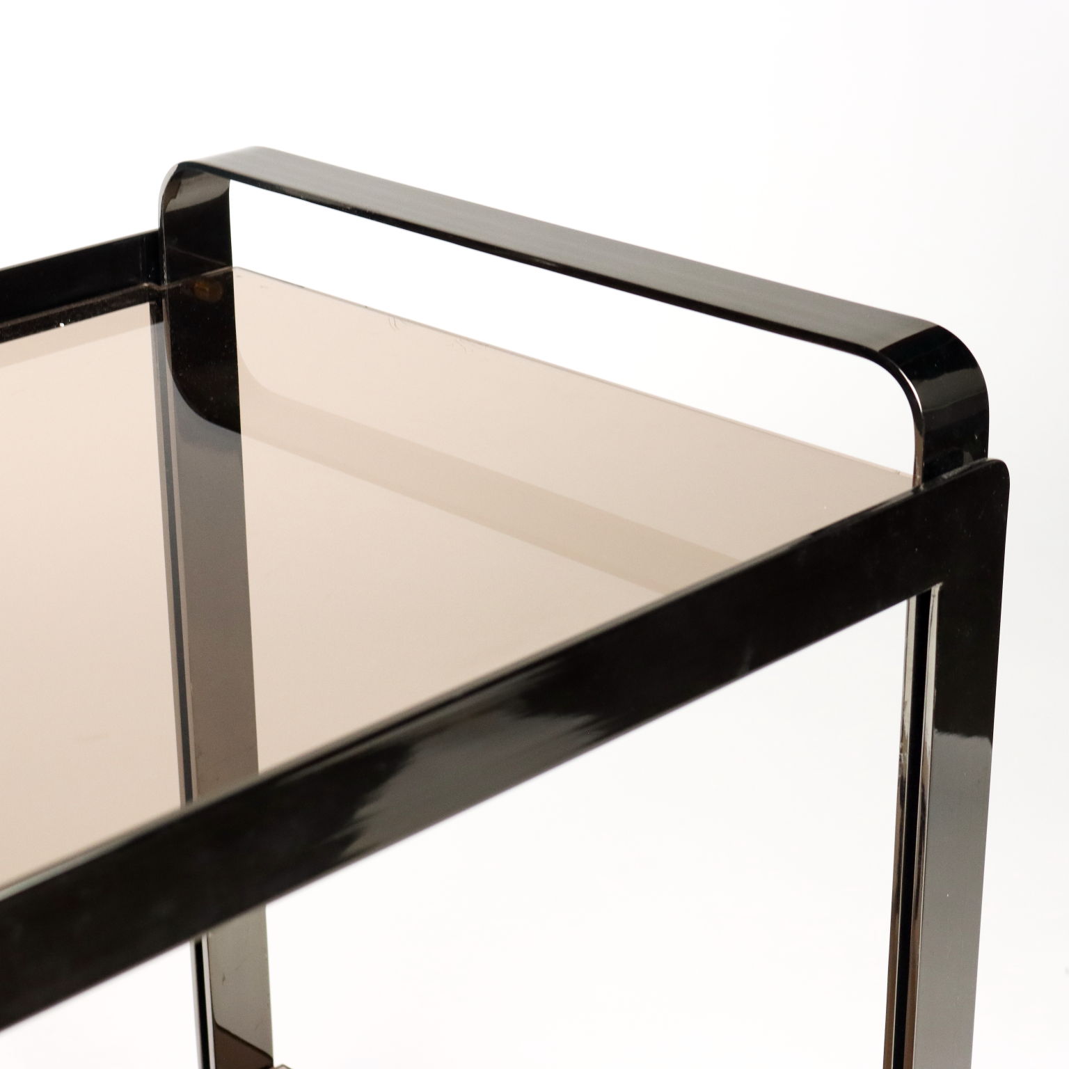 Carrello di servizio in alluminio nichelato e vetro fumè.