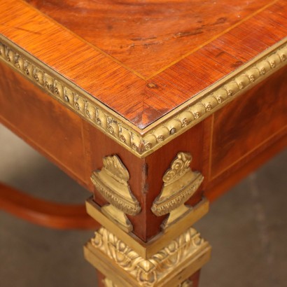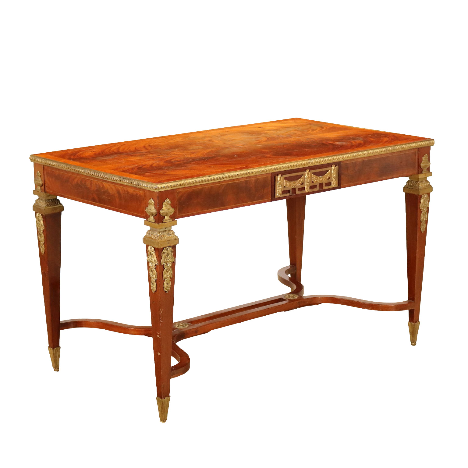 Scrittoio con piano impiallacciato in mogano, piuma di mogano e acero con due cassetti sottopiano e gambe tronco-piramidali raccordate da traversa centrale. Bronzi di gusto neoclassico finemente cesellati e dorati a decorare fascia sottopiano, gambe, traversa e piedini a bicchiere.
