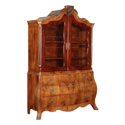 Comò con alzata con cimasa intagliata a formare festone di foglie e vetrina a due ante con bocchette decorate e montanti a 45 gradi con semicolonne dai capitelli bronzei. Cassettone sottostante a fronte mosso, composto da tre cassetti con maniglie ornamentali in bronzo, montanti e piedini mossi. Impiallacciatura in mogano, interni in rovere. Il mobile conserva i pannelli originali delle ante che ora portano i vetri, sono realizzati in mogano con intagli fogliacei. Olanda metà XIX secolo