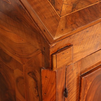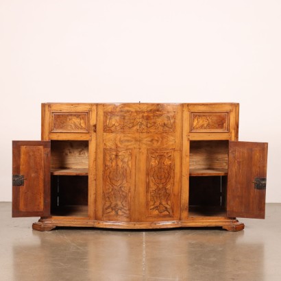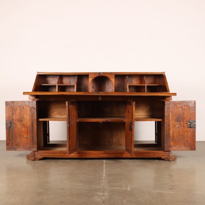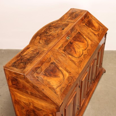 Grande scrivania a giorno con anta a ribalta decorata con pedule di noce entro riserve filettate in acero, scarabattolo con ripiani e vano a giorno, tiretti sottostanti e fronte a quattro ante decorate con pedule entro riserve, retro con parte centrale bombata e due ante. Modifiche e sostituzioni Italia metà XVIII secolo