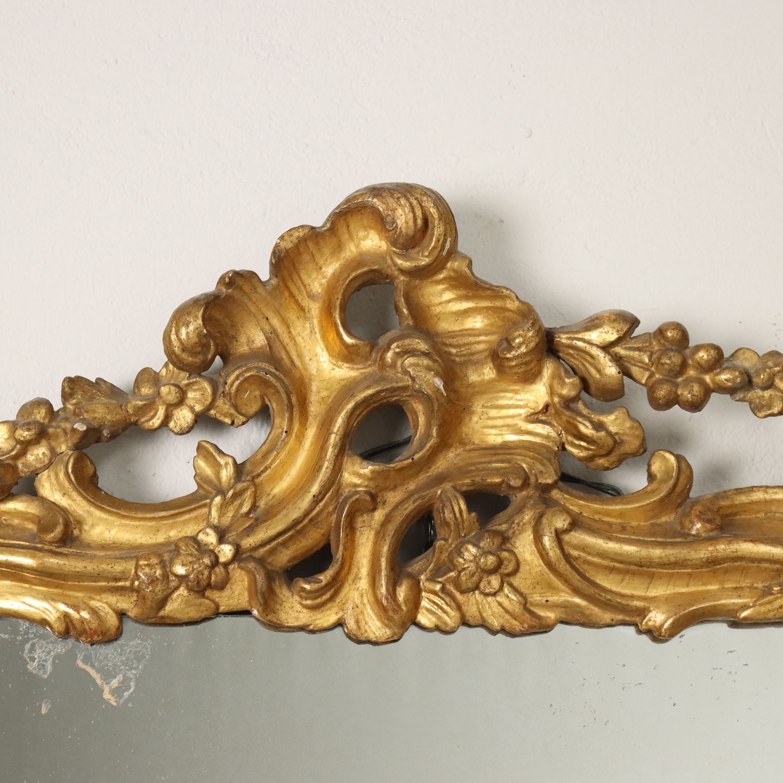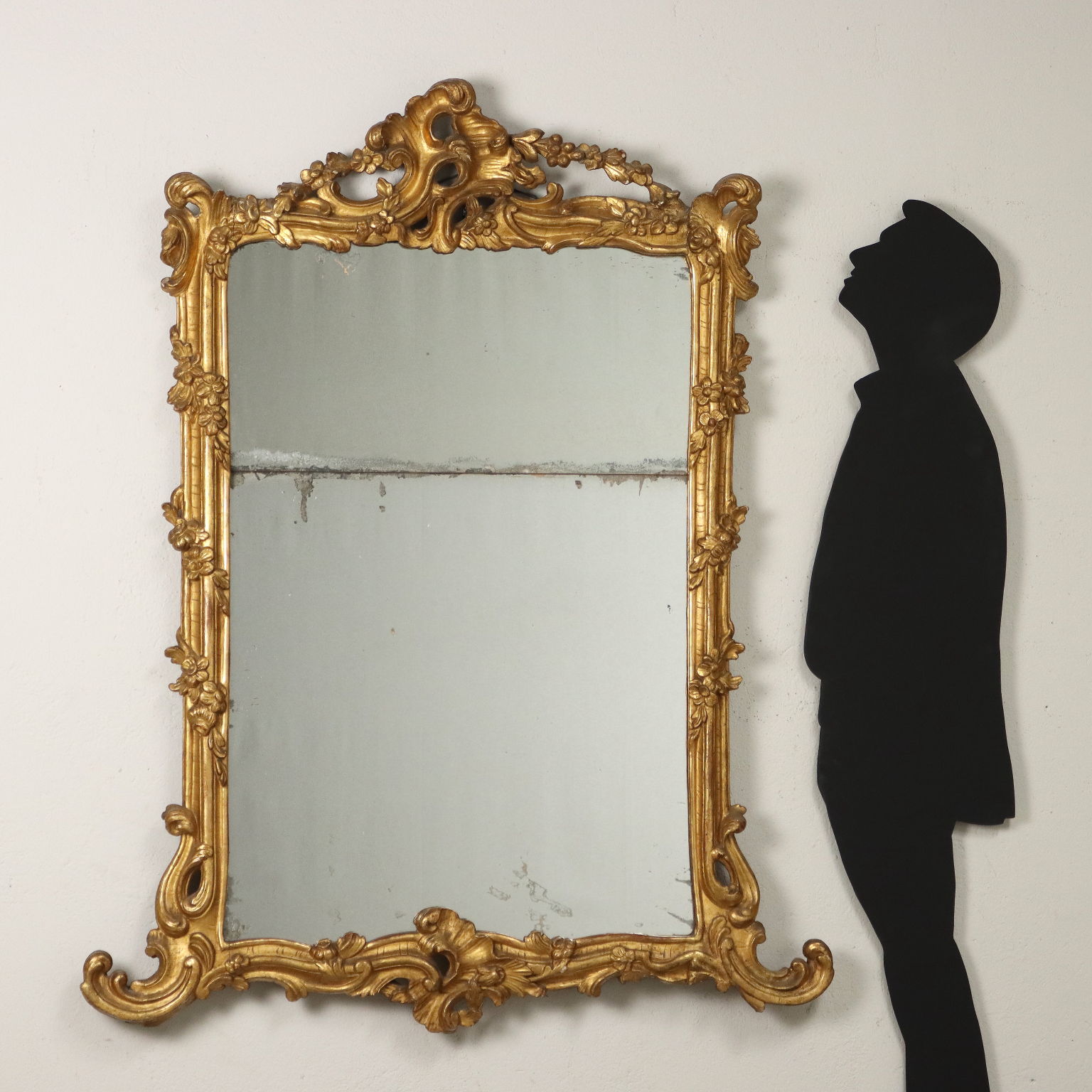 Specchiera barocchetto in legno intagliato e dorato, Lombardia metà XVIII secolo. Cimasa dalla quale si dipartono festoni floreali che si avvolgono sui montanti. Completano la decorazione elementi a "C", rocaille e volute fogliacee. Doratura ripresa.