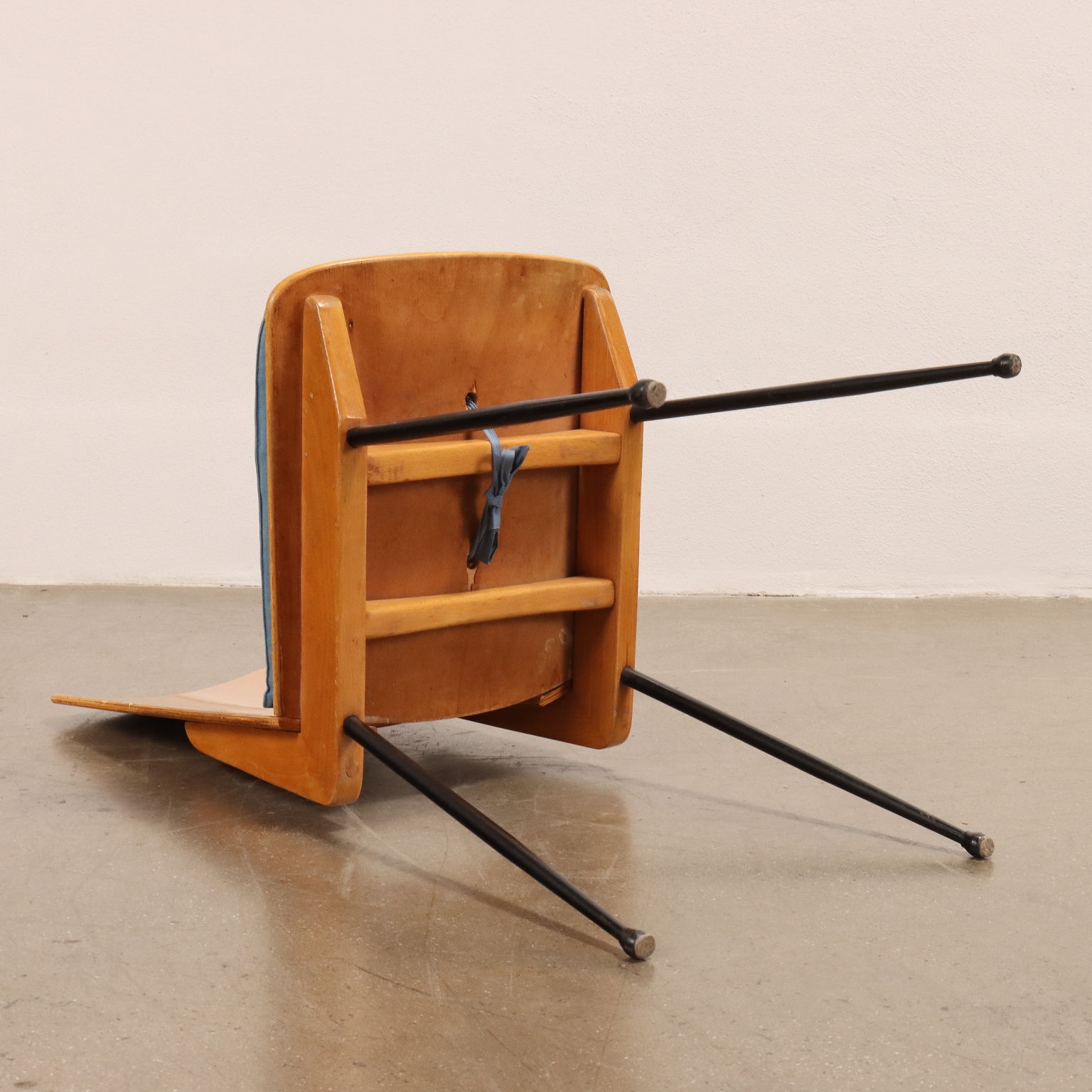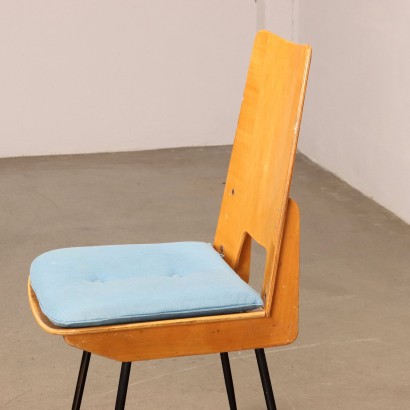 Gruppo di 6 sedie con base in metallo smaltato, compensato curvato con finitura al poliestere e cuscino di seduta. Sedie dalla forma particolare, il cuscino si presta ad essere personalizzato con un nuovo tessuto per rendere il prodotto più attuale e adatto anche ad un ambiente living contemporaneo ma con un tocco vintage. Il prodotto può essere restaurato del nostro laboratorio con intervento che prevede sverniciatura e nuova finitura a gomma lacca e cera, rifacimento dei cuscini con un nuovo tessuto scelto tra le nostre diverse campionature.