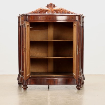 Piccola credenza impiallacciata in essenze esotiche, Piemonte metà XIX secolo. Fronte a due ante pannellate ornate da corniciature, montanti a colonna torniti, piedi a trottola. Decorato da riserve impiallacciate in radica di mogano. Interni noce e pioppo.