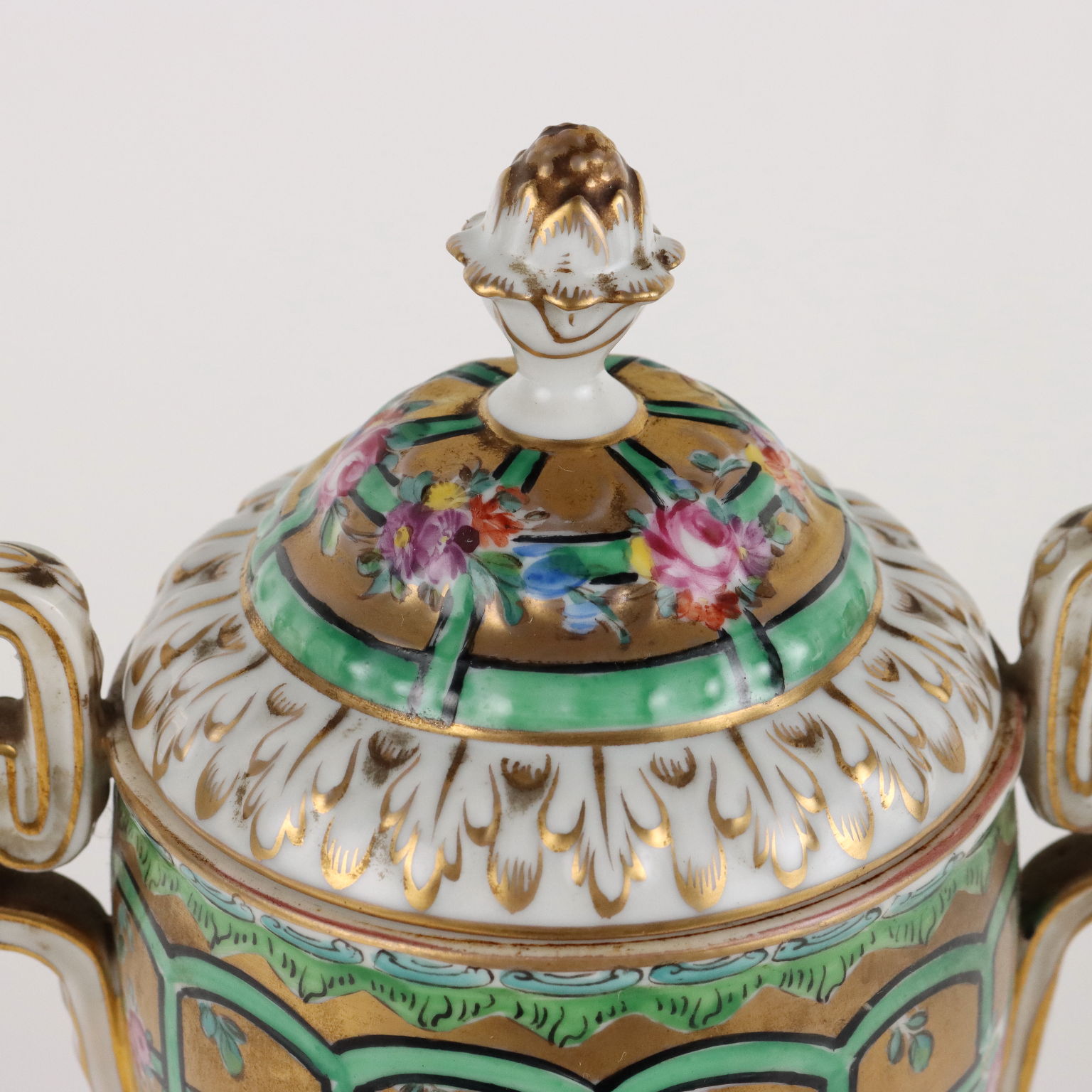 Vaso in porcellana di Sèvres con coperchio. Decori nei toni del verde, oro e motivi vegetali policromi. Sotto la base marchio della manifattura.
