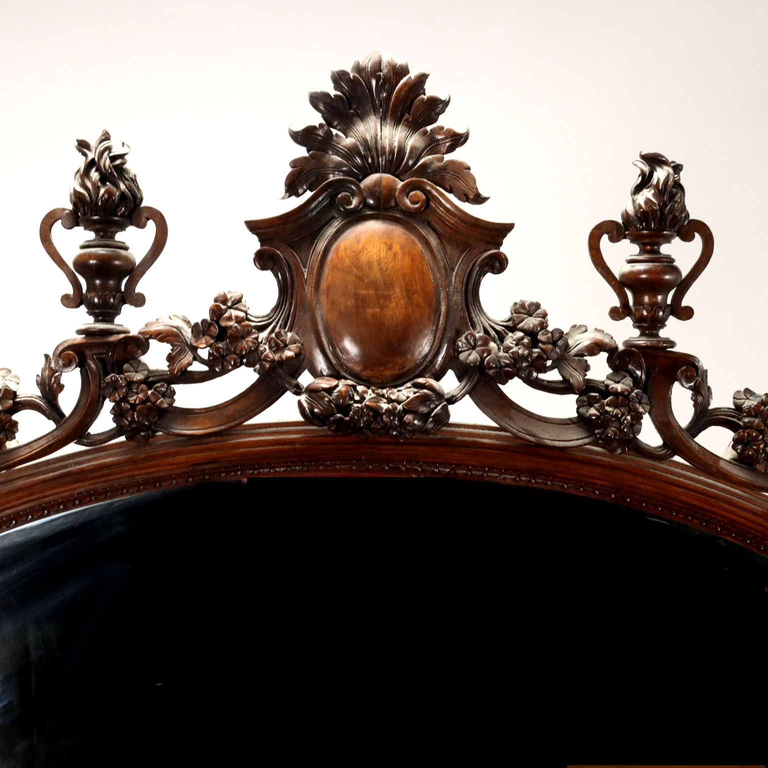 Credenza con specchiera in stile Neorinascimento, impiallacciata noce, Italia inizio XX secolo. Specchiera semicircolare con vetro bisellato, affiancata da coppia di mensole intagliate; corpo credenza con coppia di ante sul fronte e due finte ante bombate sui lati, tutte composte da vetri molati. Il mobile è abbellito da colonne grissinate, terminanti nella sezione inferiore con piedi intagliati a foglia d'acanto. Riccamente intagliata, presenta decori a cartiglio, vasiformi, a foglie d'acanto ed elementi floreali, a riccioli e a ventaglio. Pomoli a testa ferina.