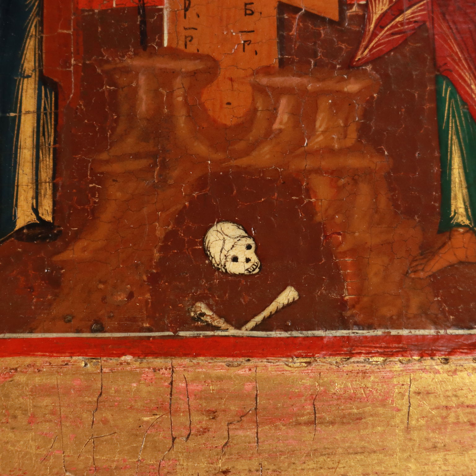 Tempera su tavola. Celebrazione della Santissima Trinità, allineata verticalmente al centro, con la figura di Cristo Crocifisso dominante. Ai due lati della Croce, sei figure di Santi ,a destra tre uomini tra i quali si riconoscono San Giorgio e Il Battista; a sinistra tre figure femminili no identificate. La tavola si presenta in buone condizioni, con listelli lignei a rinforzo posteriore.