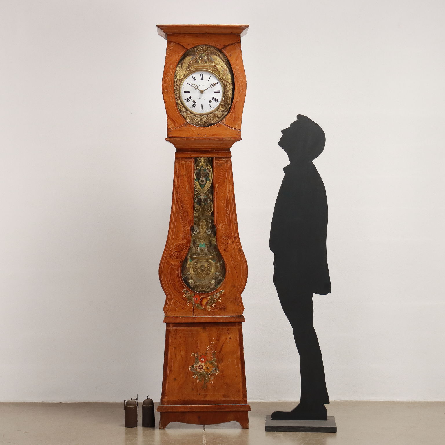 Orologio a pendolo Comtoise in abete laccato, Darney (Francia) fine XIX secolo. Struttura laccata a finto legno con decorazioni floreali dipinte e motivi incisi. Mostra in metallo smaltato con numeri romani; cornice mostra e pendolo a lira in lamierino stampato dorato e parzialmente dipinto, ritraenti pavoni, vasi, serti di fiori e frutti, riccoli ed elementi a "C". Quadrante firmato "DUPUPET à Darney". Meccanismo coevo.