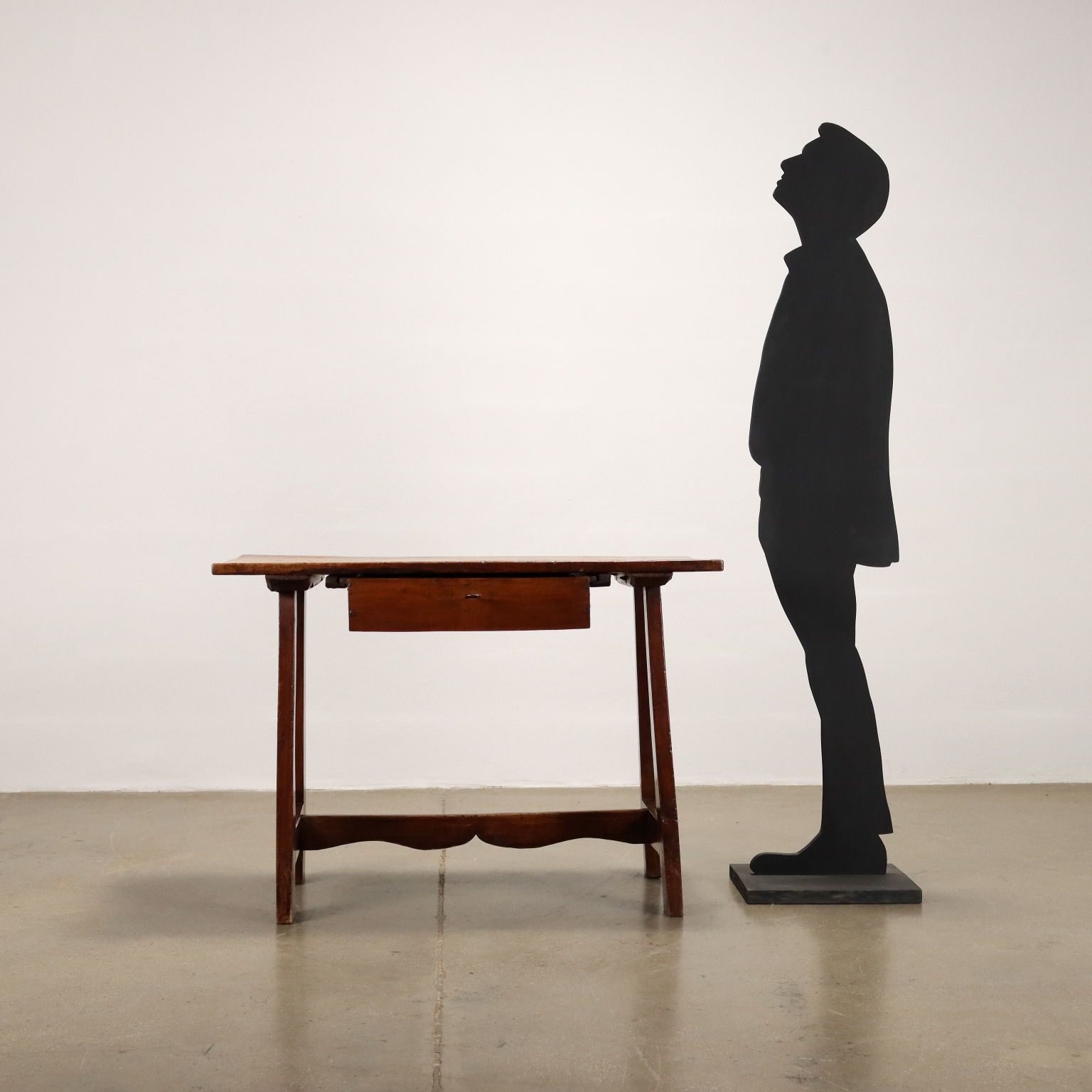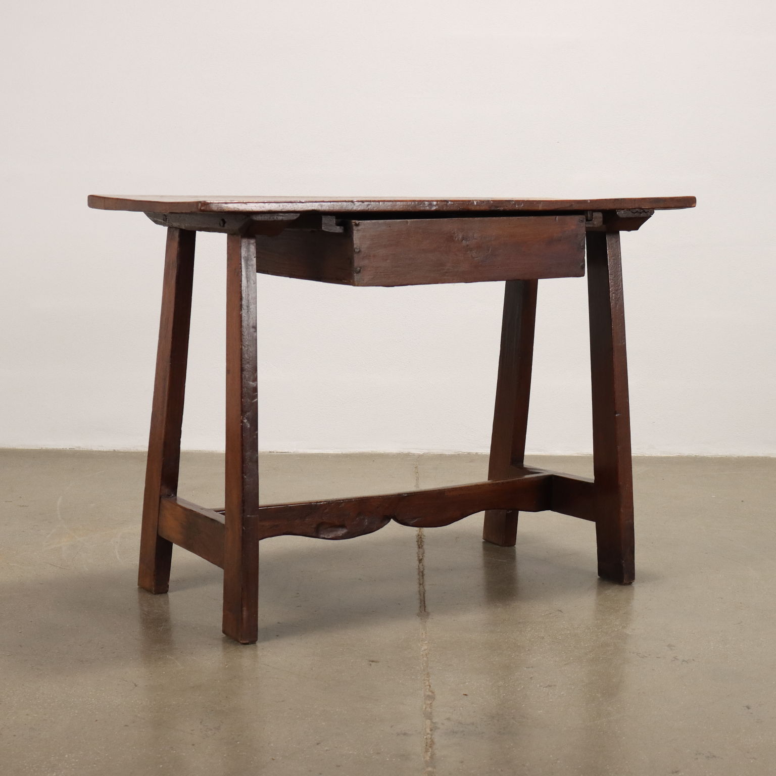 Tavolino in olmo e noce, realizzato con legni antichi, Italia inizio XX secolo. Cassetto nella fascia, gambe a cavalletto raccordate da traverse. Interni in abete. Restauri.