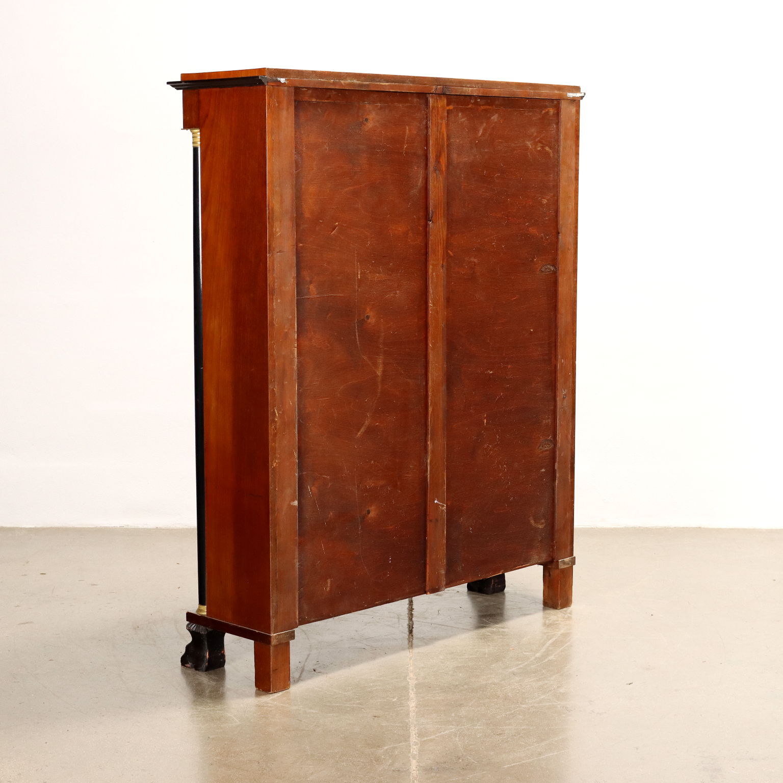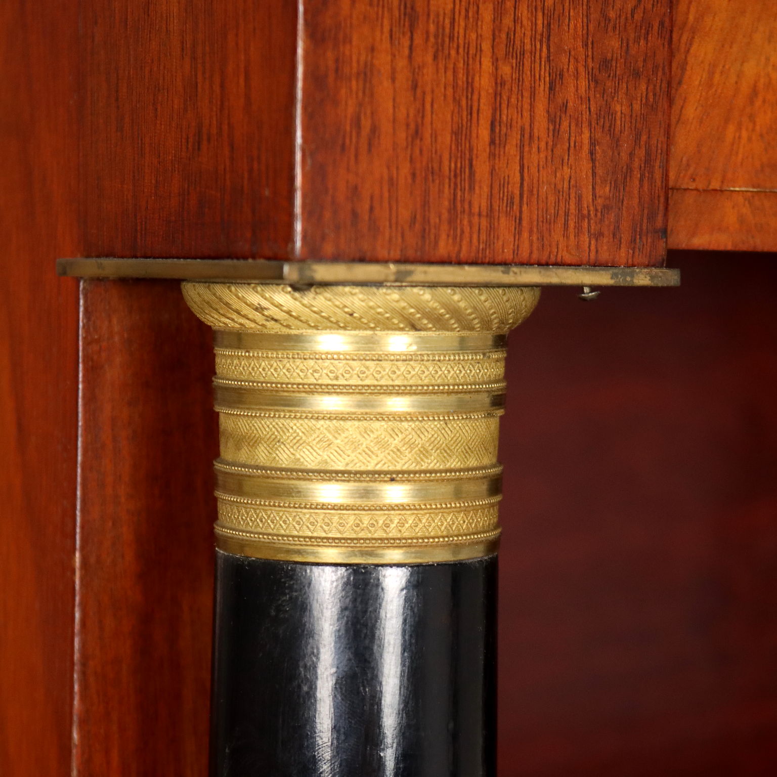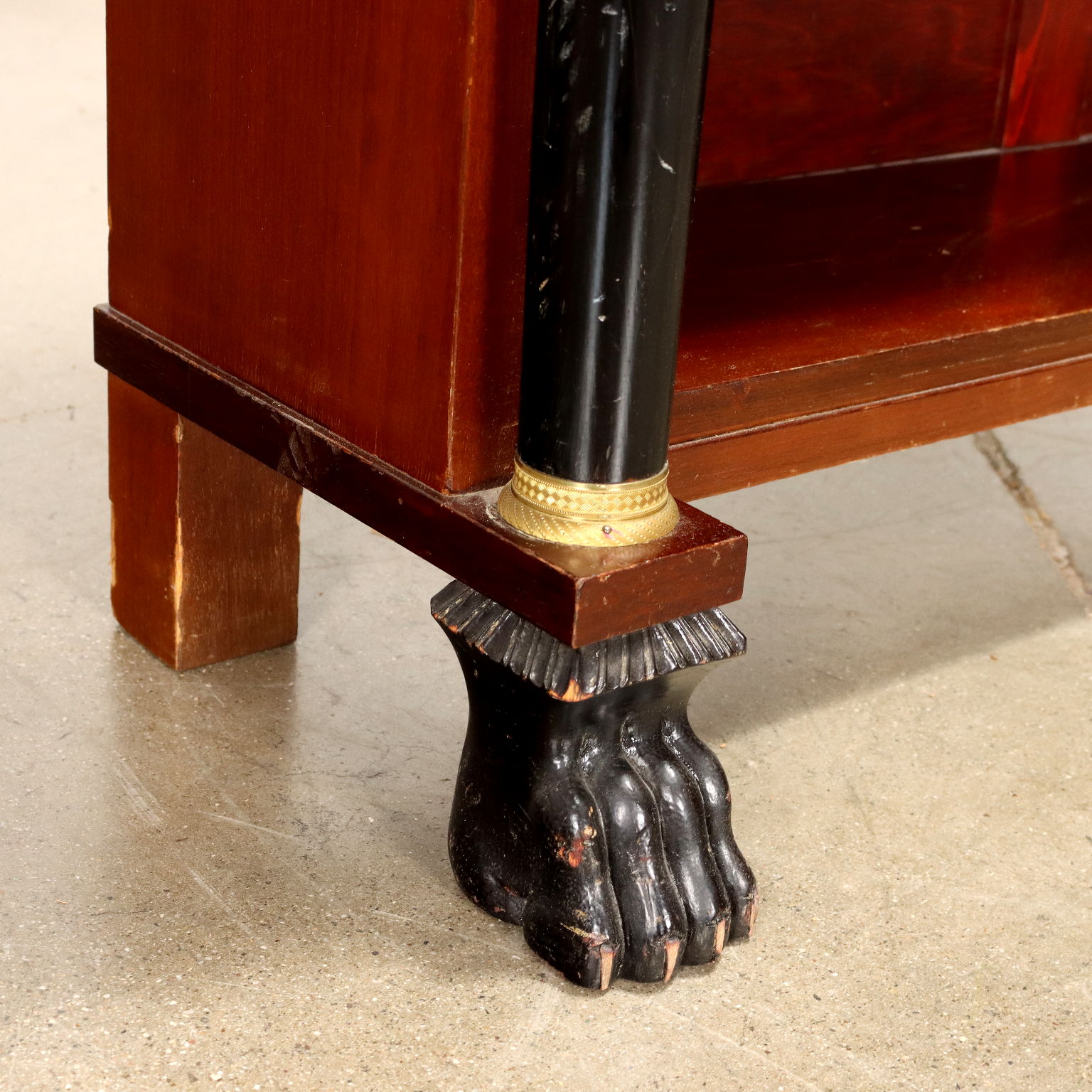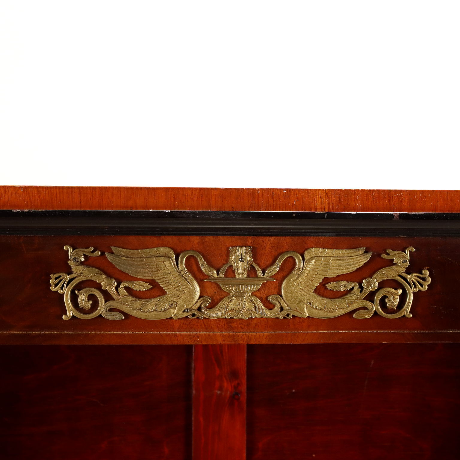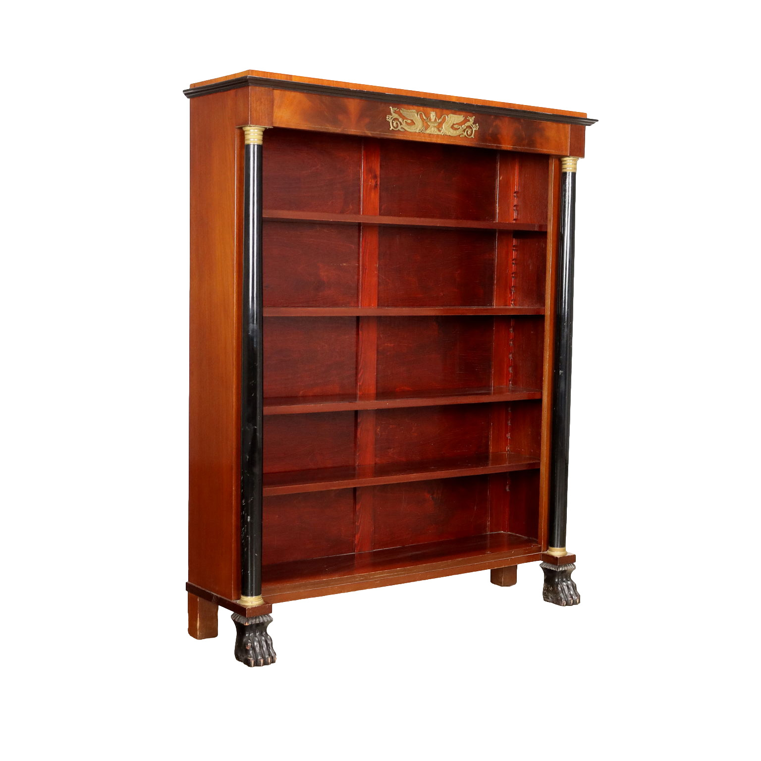Libreria in stile impero impiallacciata in mogano e piuma di mogano, Italia XX secolo. Fascia sottopiano con applicazione bronzea ritraente vaso posto entro coppia di cigni affrontati. Modanatura parte superiore, colonne e piedi ferini anteriori in legno ebanizzato.
