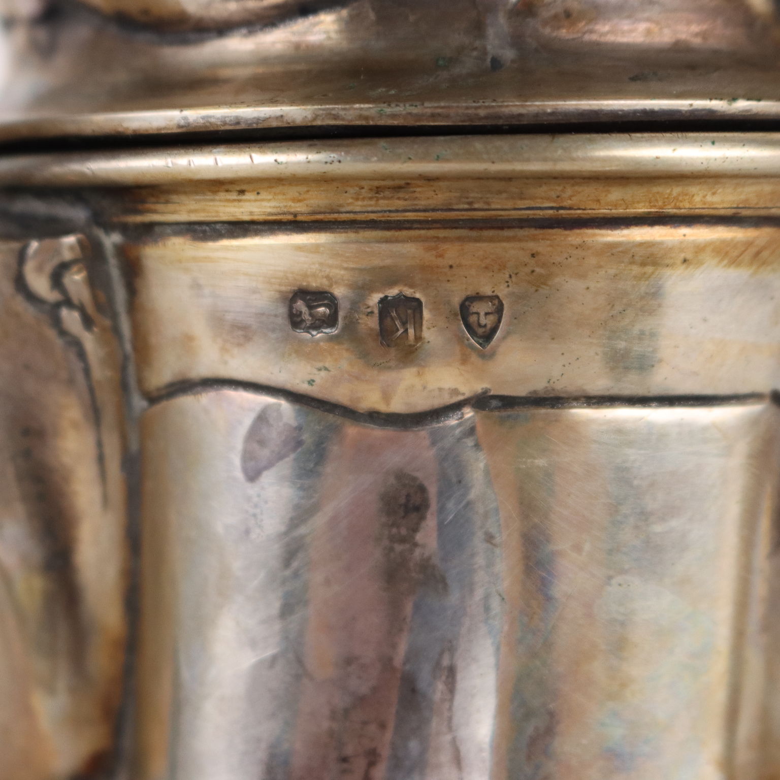 Teiera in argento retta da quattro piedini a volute fogliacee. Manico e presa del coperchio in legno. Marchi dell'argento incussi sul bordo. Grammi netti 1000 ca.