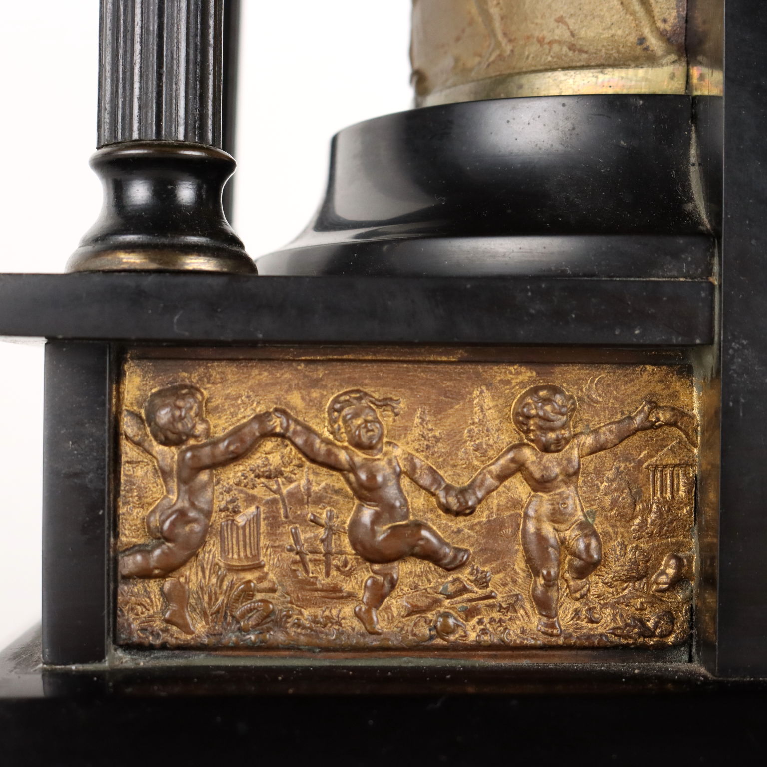 Orologio da appoggio a tempietto in marmo nero con incisioni dorate a motivi vegetali e inserti in bronzo dorato raffiguranti scene con figure mitologiche e putti. Mostra con ore a numeri romani protetta da coperchio in vetro bisellato. Al centro dell'orologio targa con dedica.