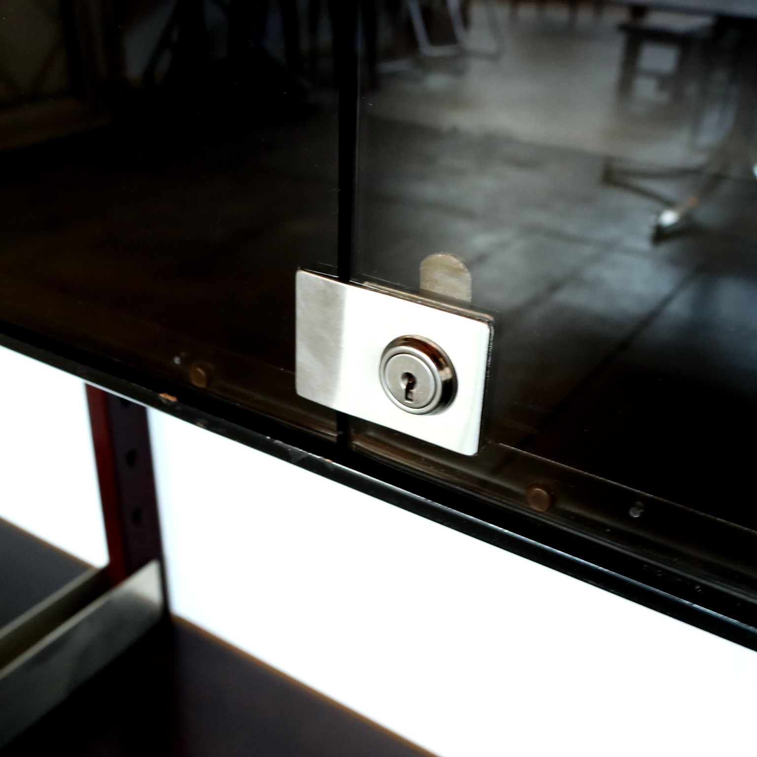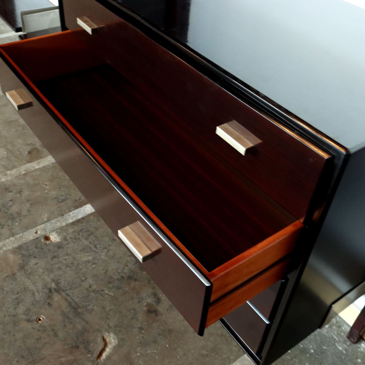 Grande libreria vintage a parete a quattro campate con ripiani, vani contenitori, cassetti e vetrine centrali a posizione regolabile. In legno esotico e legno tinto con maniglie e attacchi dei ripiani in metallo