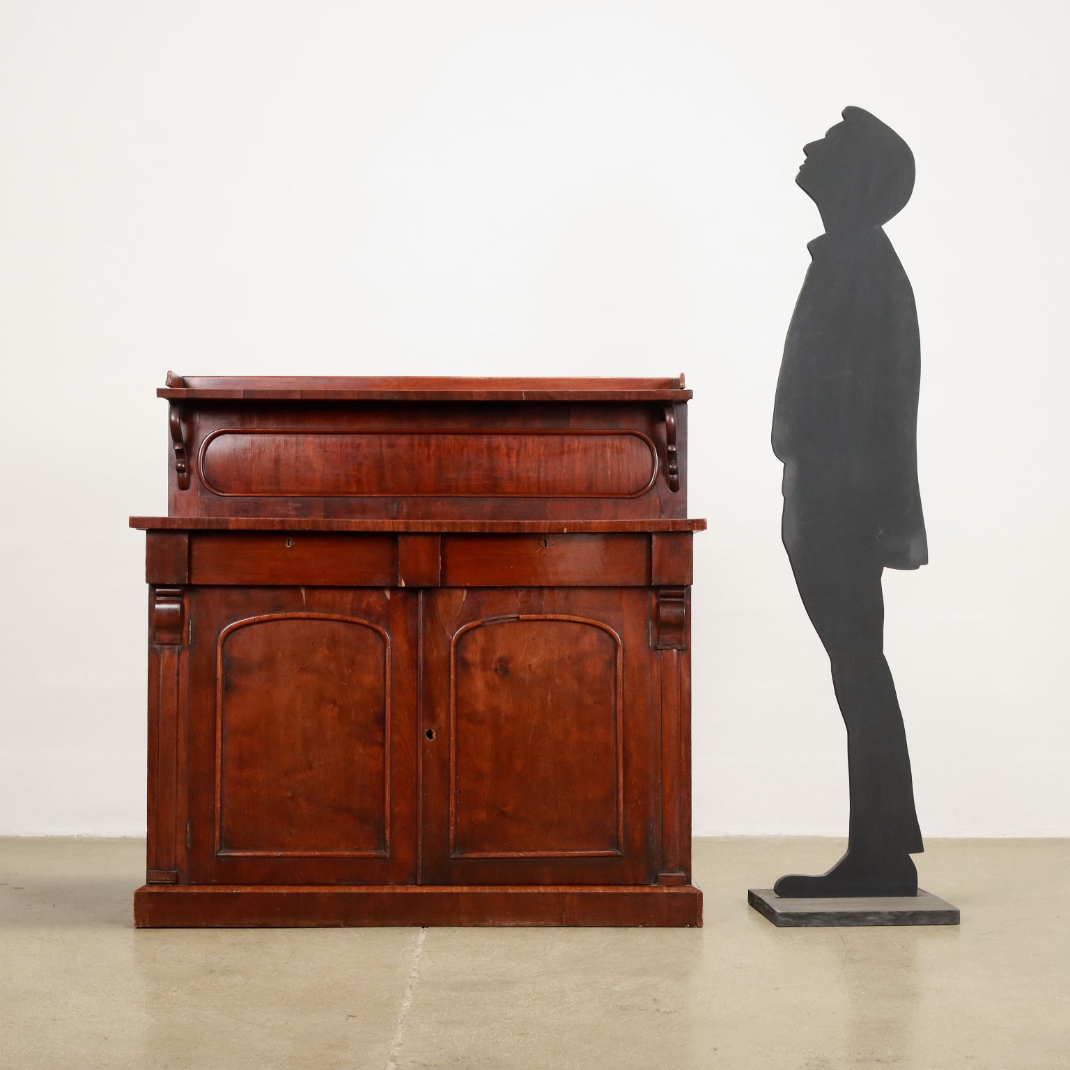 Credenza con fronte a due ante incorniciate da montanti con semicolonna e due cassetti nella fascia sottopiano aggettante; sul fondo, piattaia con mensola, retta da supporti intagliati a ricciolo. Impiallacciatura in mogano. Inghilterra terzo quarto XIX secolo