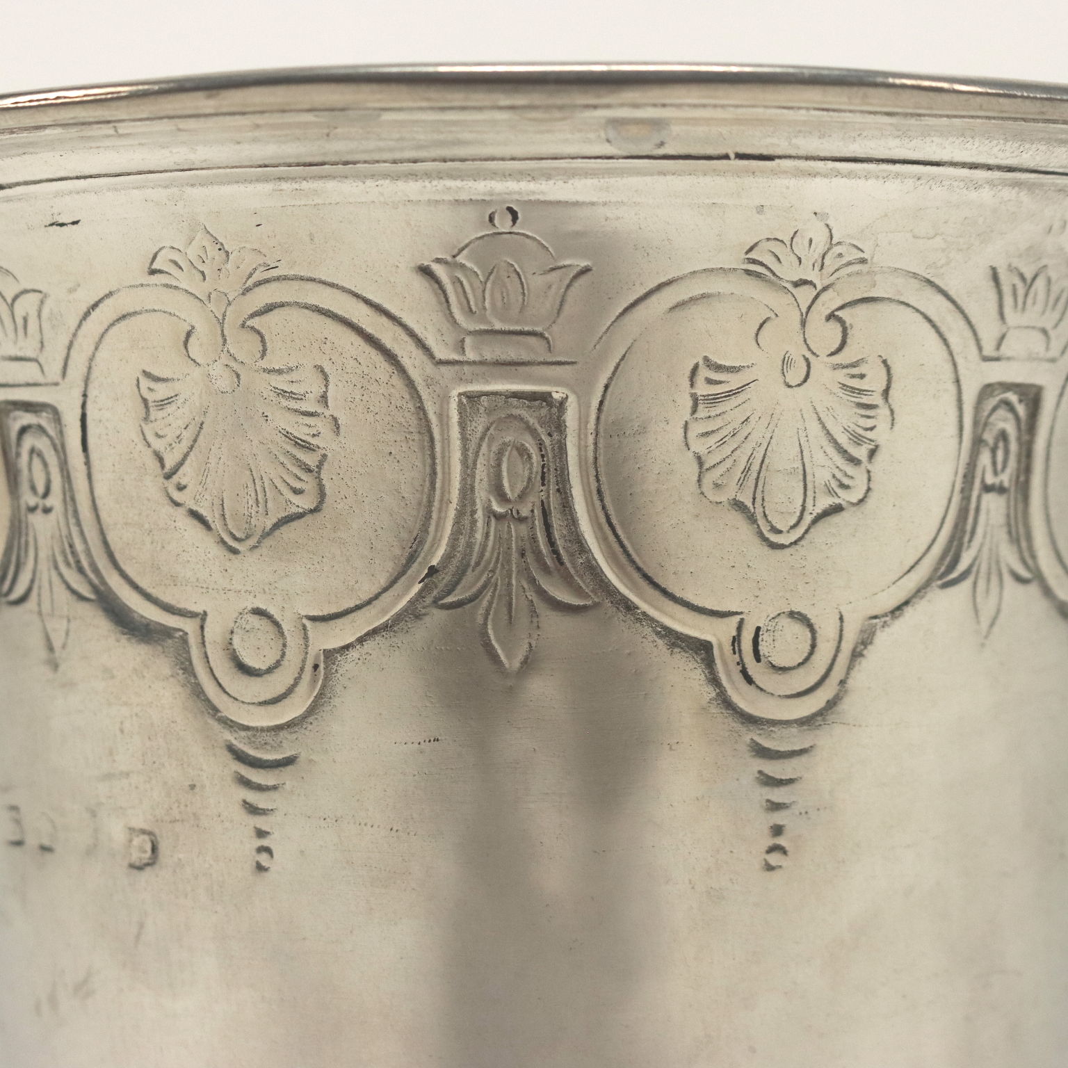 Coppia di secchielli da ghiaccio con colonna in metallo. I secchielli in peltro presentano decori incisi nella fascia alta e marchi incussi.