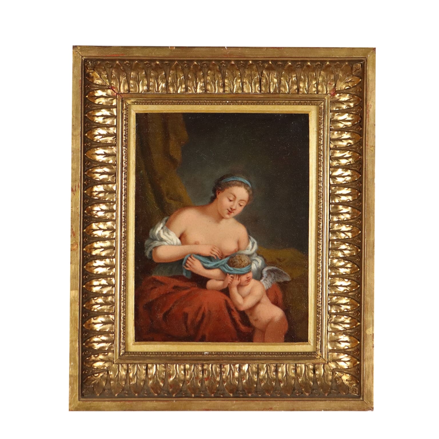 Olio su tela. Nella piccola scena ,ambientata in un interno appena accennato, la dea Venere, discinta, sta scherzosamente bendando con uno dei suoi veli gli occhi del piccolo putto alato poggiante sulle sue ginocchia, il quale cerca di liberarsi la faccia: secondo l'iconografia tradizionale, tale gesto compiuto dalla dea vuole associare l'amore carnale al peccato e dunque all'oscurità; o più semplicemente vuole ricordare che secondo la tradizione popolare, l'amore è cieco! L'opera è presentata in cornice dorata di fine '800.