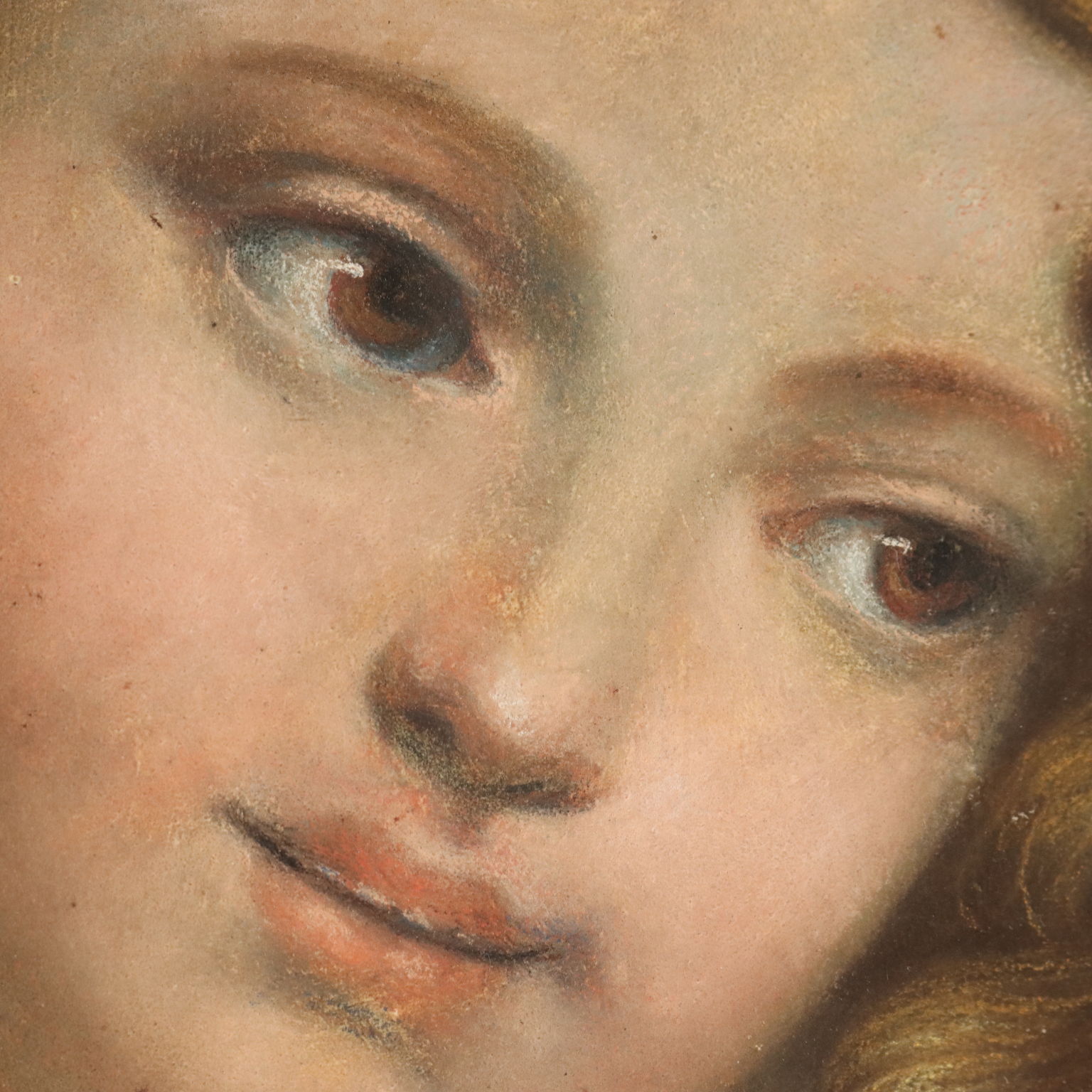 Pastelli su carta, applicata su telaio. Delicato primo piano di una giovinetta, dallo sguardo innocente e timido rivolto verso il basso. Il disegno è presentato in cornice di fine '800.