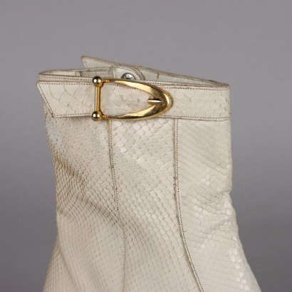 Rari stivaletti anni 70 dello storico calzaturificio bolognese Bruno Magli. Sono in pelle verniciata bianca, tacco 4 cm, allacciatura laterale con cerniera. Le condizioni sono quasi perfette: ci sono alcuni piccoli segni sulla pelle, ma sono state indossate pochissimo.