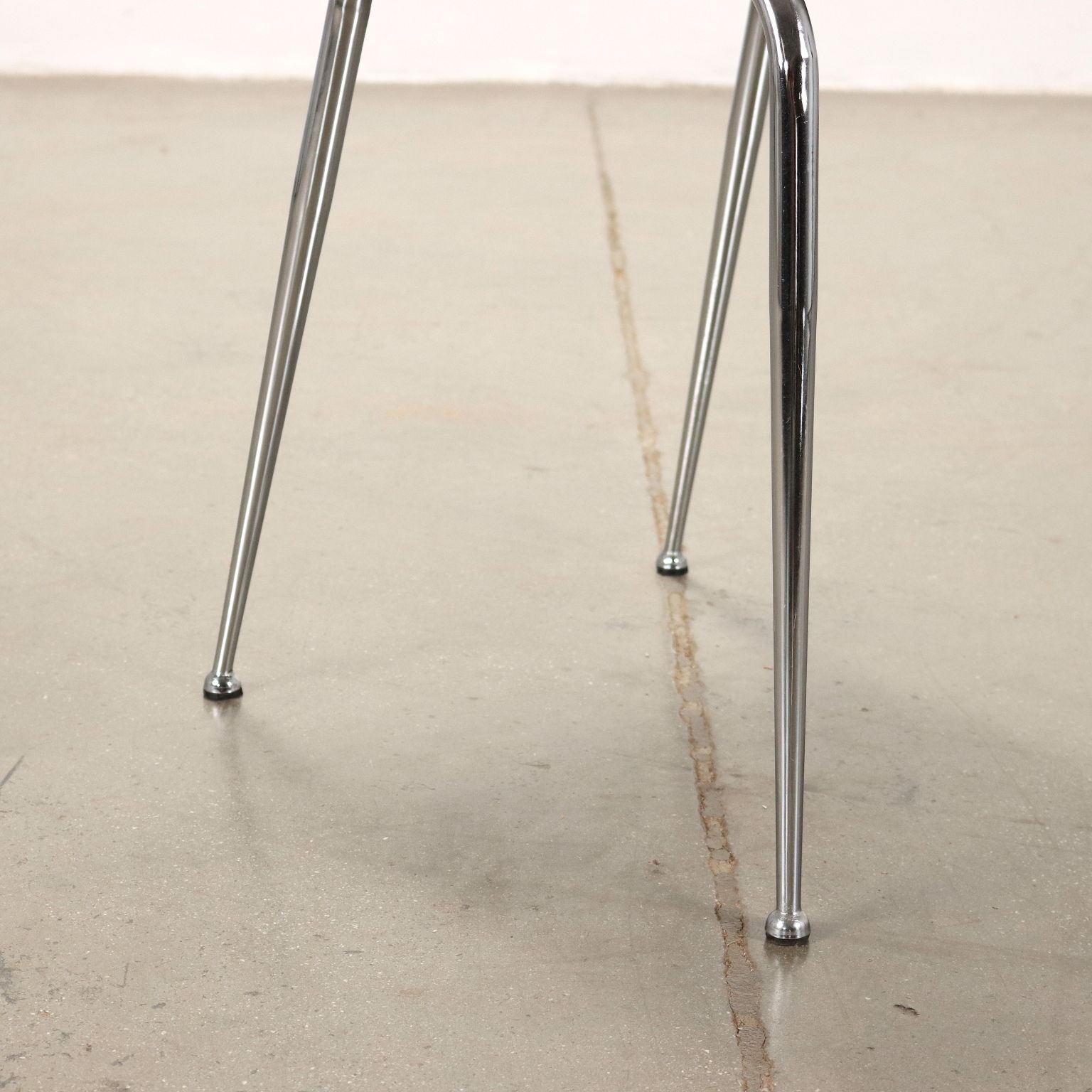 Gruppo di 4 sedie in metallo cromato con seduta imbottita in espanso e rivestimento in similpelle; un gruppo di sedie dalla linea tipicamente Vintage, accuratamente restaurate dal nostro laboratorio con intervento di pulizia della cromatura originale e rifacimento della seduta con nuova imbottitura e rivestimento, adatte per un ambiente Living dove si vuole riprendere uno stile originale ma con un tocco di altri tempi.