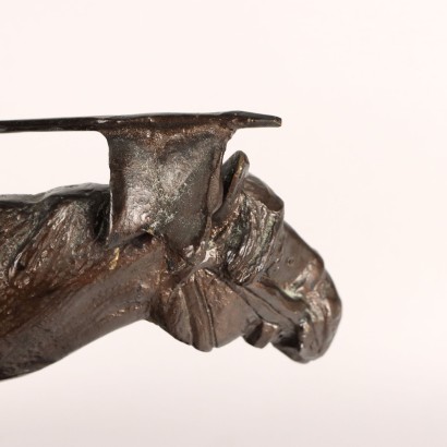 Scultura in bronzo patinato raffigurante soldato a cavallo. Sulla base firma incussa dell'autore.