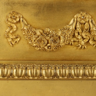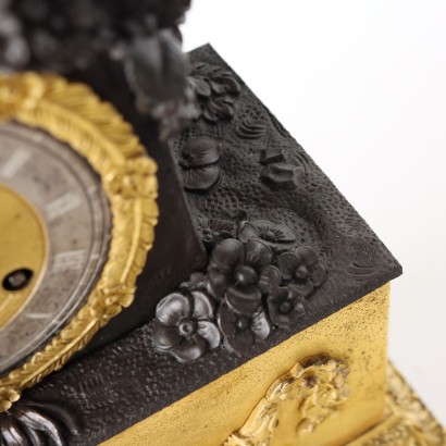 Orologio da appoggio in bronzo dorato e a patina scura. L'orologio a base rettangolare è retto da piedini a foggia di fiore e presenta decori con ghirlande fiorite e motivi ripetuti. L'orologio è sormontato da figura mitologica. Mostra con ore a numeri romani.