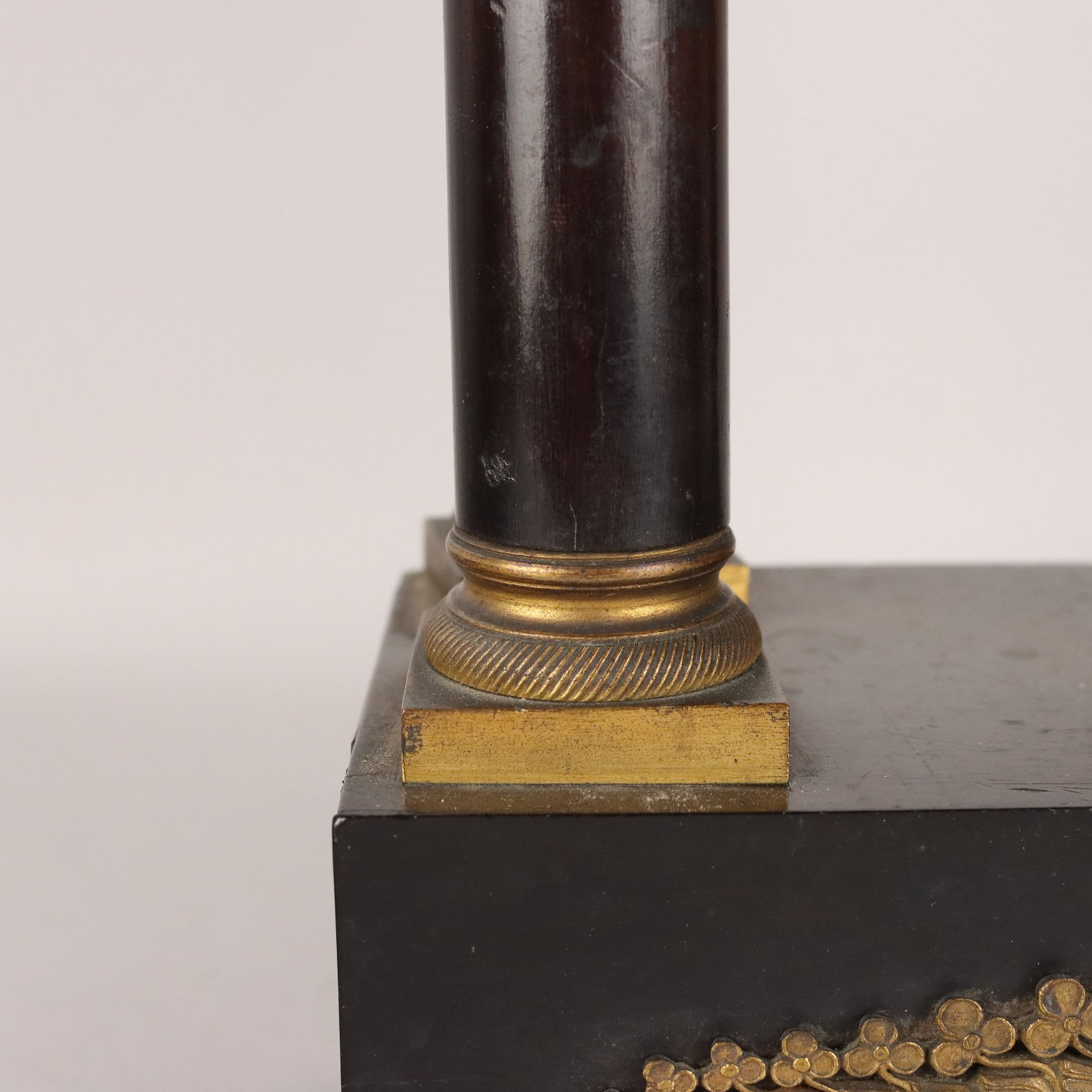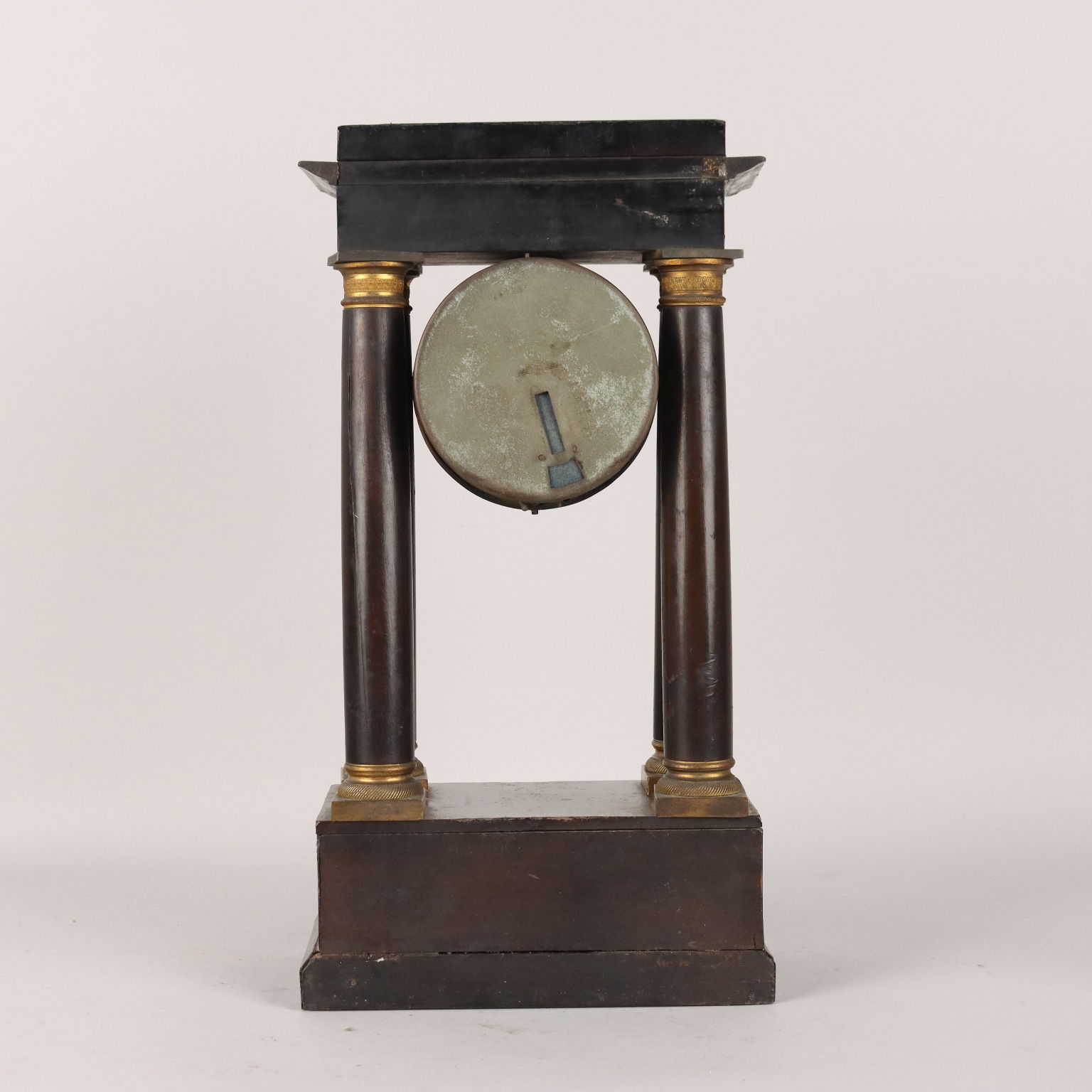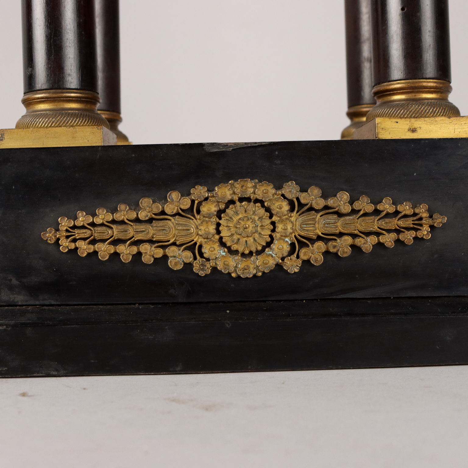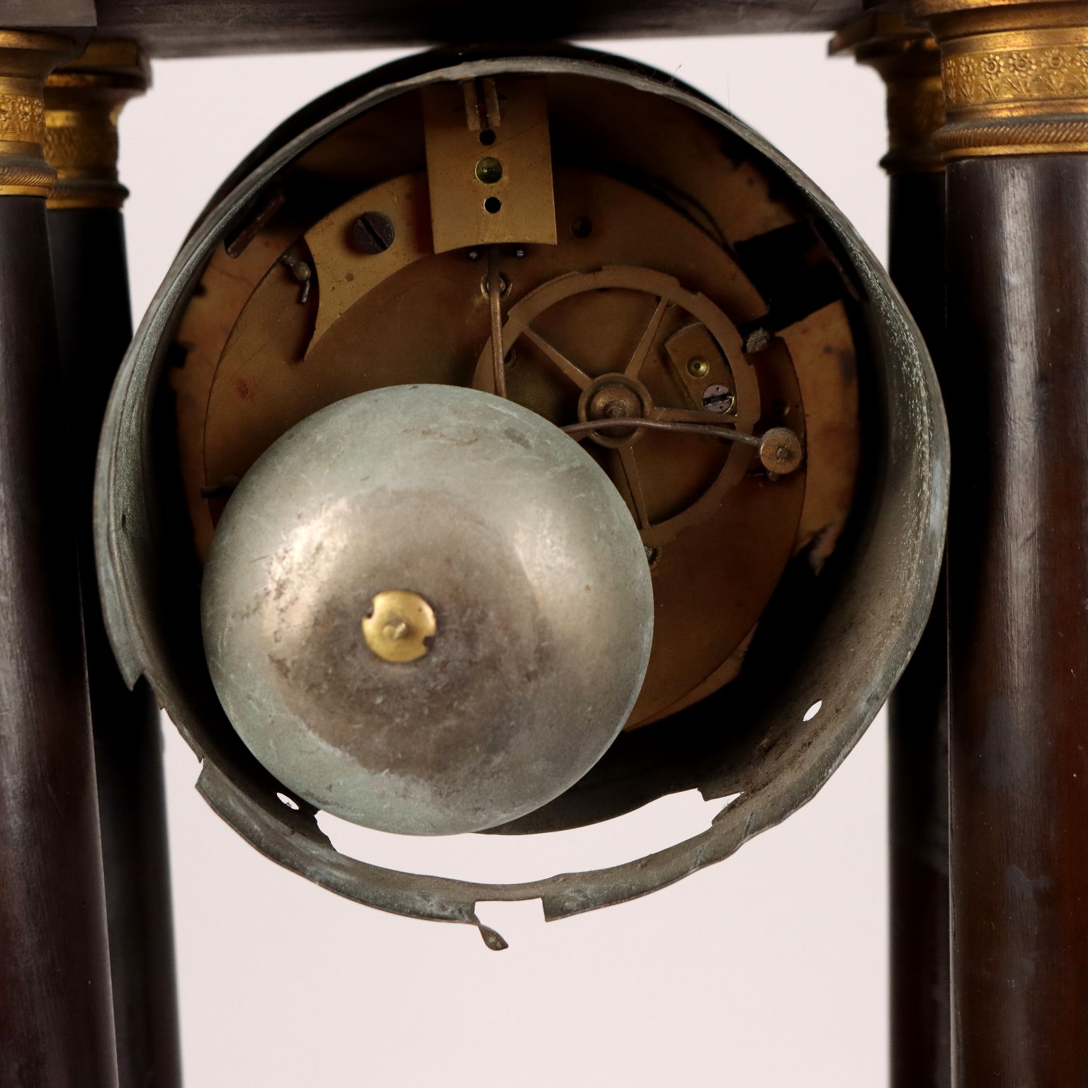 Orologio a tempietto in legno con decori applicati in bronzo. La base e il capitello delle colonne sono in bronzo dorato. Mostra con ore a numeri romani.