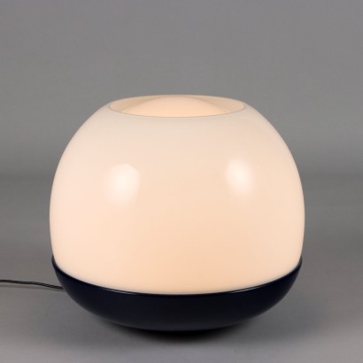 Lampada da tavolo con base in metallo smaltato e vetro bianco.