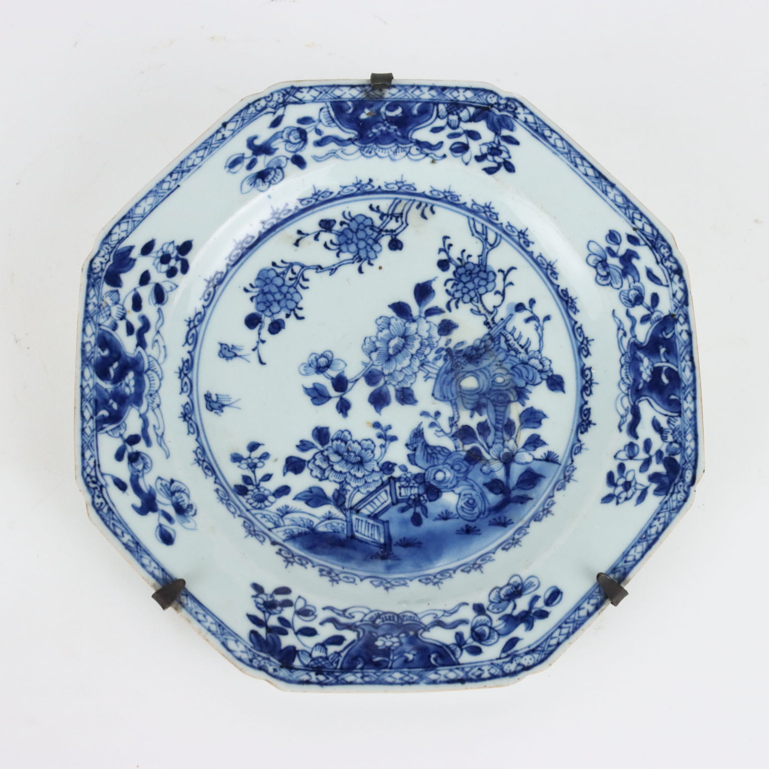 Coppia di piatti in porcellana dipinta in blu sottocoperta con roccia ornamentale circondata da piante di peonia ed uccelli in un giardino fiorito. Decoro a losanghe sul bordo e fiori sulla tesa.