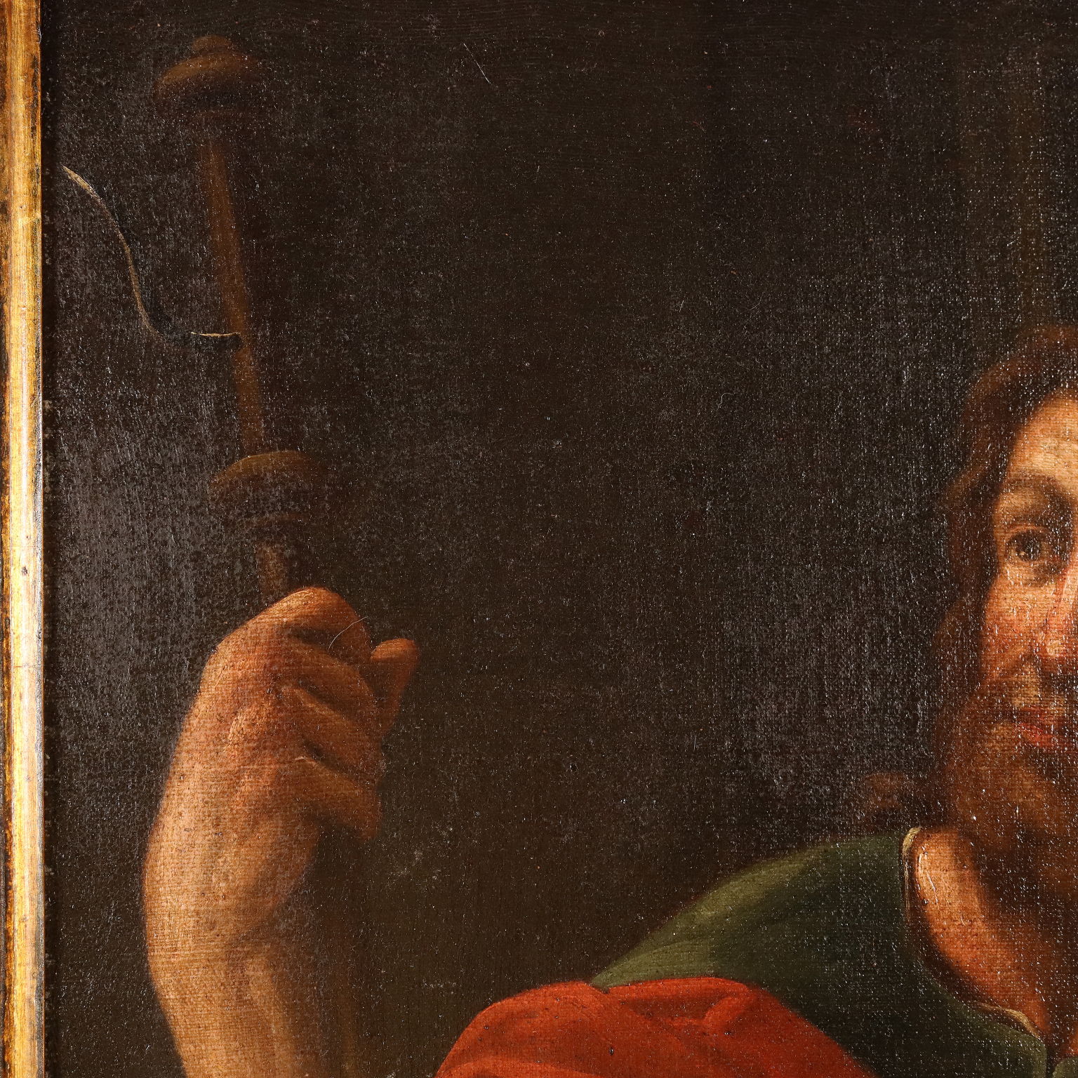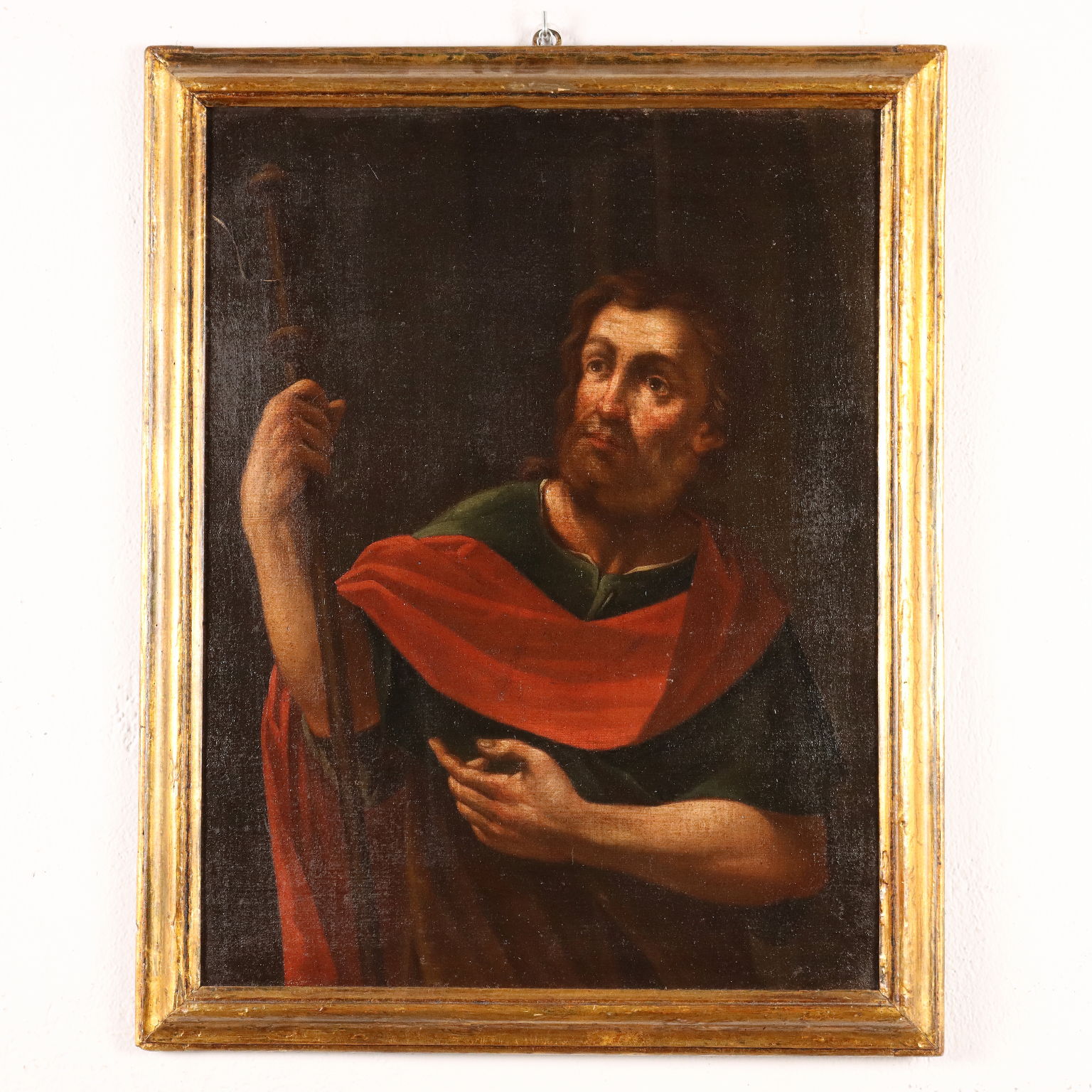 Olio su tela. Scuola italiana del XVII secolo. San Giacomo di Alfeo, uno dei Dodici apostoli di Gesù, è detto il minore per essere distinto chiaramente dall'altro apostolo di nome Giacomo, il cui padre era invece Zebedeo e che viene chiamato dalla tradizione Giacomo il Maggiore. In questo dipinto è raffigurato secondo l'iconografia classica, che lo descrive con la barba e i capelli lunghi, vestito con la tunica e il pallio, che regge un lungo bastone uncinato; il suo attributo, infatti, è lo strumento con cui fu martirizzato, ovvero il bastone usato per cardare la lana con un'estremità triangolare uncinata. Restaurato e ritelato, il dipinto è presentato in cornice ridorata di fine '800.