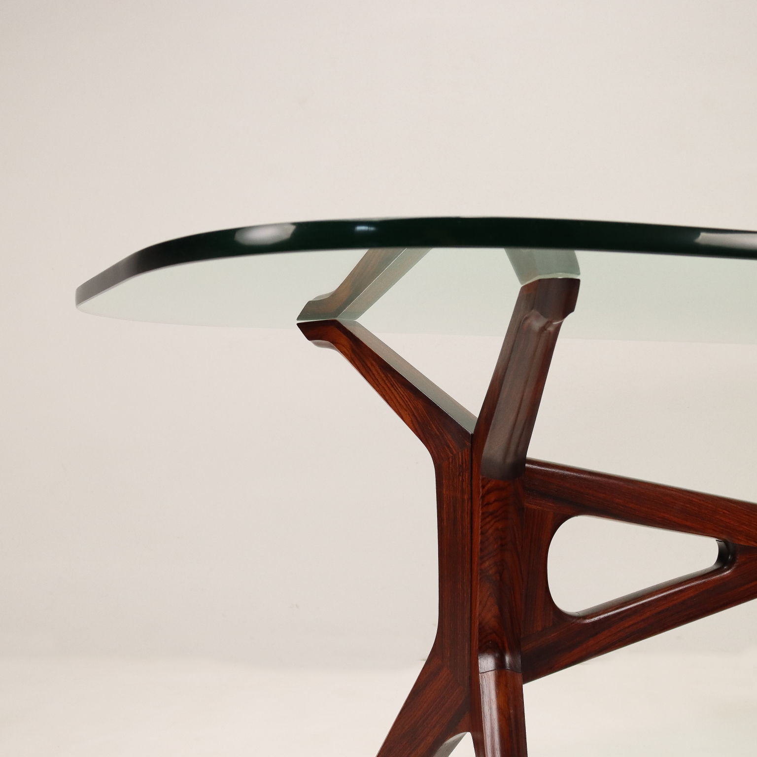 Elegante tavolo con base in legno di Faggio tinto, piano in vetro, non originale del periodo. Restaurato. Un elegante arredo, rivisitato con la sostituzione del piano in legno con uno in vetro, che permette di meglio valorizzare la struttura della base con le forme e le linee tipiche degli anni 50-60, un tavolo che si presta ad essere collocato in una zona living che voglia riprendere uno stile originale con un gusto di altri tempi, e per dare nuova vita alle cose.