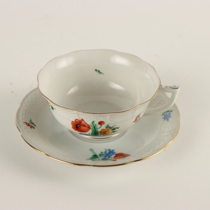 Servizio da the in porcellana bianca con decori policromi a motivi vegetali, in oro bordi e raffinate decorazioni. Prese del coperchio a foggia di rosellina. Marchio della manifattura sotto le basi. Il servizio è composto da: teiera, zuccheriera, lattiera, sei tazze con piattino e sei piatti da dolce.