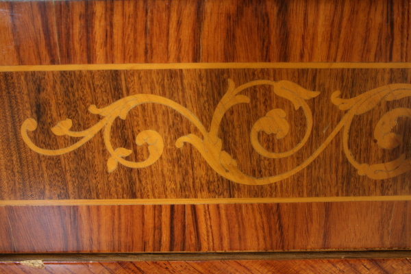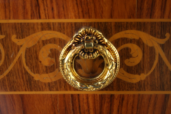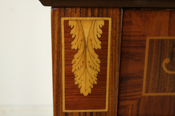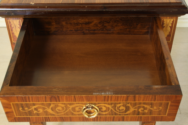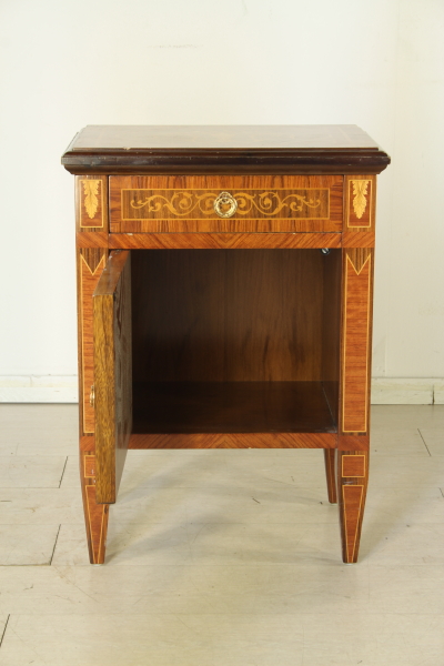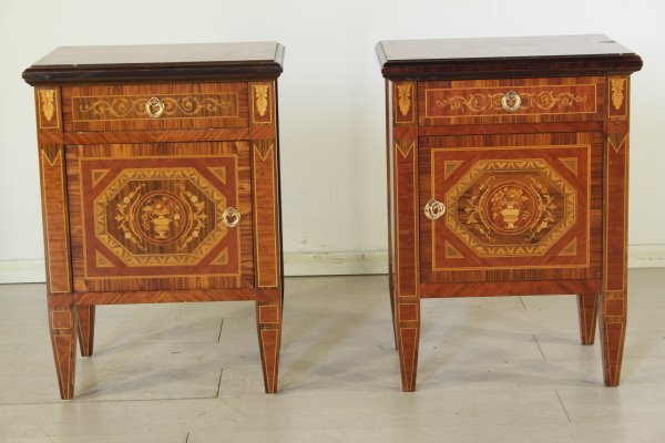 2 comodini stile neoclassico retti da gambe troncopiramidali presentano un anta e un cassetto con maniglia in ottone. Riccamente intarsiati e filettati.