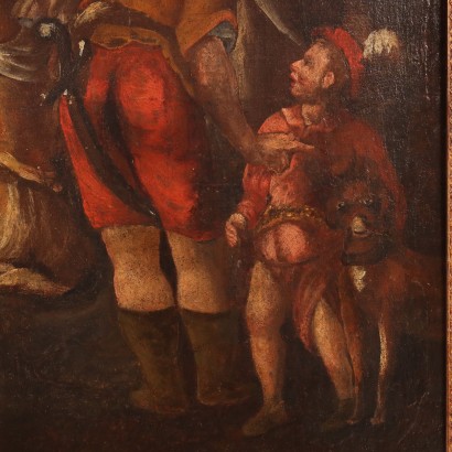 Olio su tela. Scuola italiana del XVII secolo. La grande scena rappresenta l'evento drammatico della morte di Gesù in Croce, con tutti gli attori che compaiono nel Vangelo, emergenti da uno sfondo buio e cupo nel quale si intravvede appena sulla sinistra un sole spento. Al centro la grande Croce di Cristo svetta quasi solitaria, ad occupare la parte superiore del dipinto; ai due lati le croci dei due ladroni crocifissi con Gesù, quello di sinistra, il buon ladrone redento, girato a guardare e dialogare con il Cristo, quello di destra in posizione frontale, con lo sguardo che rifugge dal centro. Ai piedi della Croce, a sinistra Maria e il gruppo delle pie donne dietro di lei, a destra San Giovanni apostolo; tutto all'intorno, i sacerdoti, gli accusatori di Gesù che ancora discutono fra loro, e di sfondo tutto il popolino. Spicca in primo piano in basso a sinistra, la figura a mezzo busto di un sacerdote di era moderna che guarda alla Croce con le mani giunte, e che probabilmente corrisponde al committente della tela. La tela è stata restaurata e ritelata, e applicata su un telaio nuovo. E' presentata in cornice in stile.