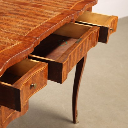 Scrittoietto con piano sagomato,fronte a cinque cassetti di cui il centrale in fascia sottopiano più grande e gambette mosse. Tutta la struttura è impiallacciata in bois de violette e intarsiata con mogano e bordure in acero. Italia XX secolo
