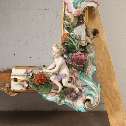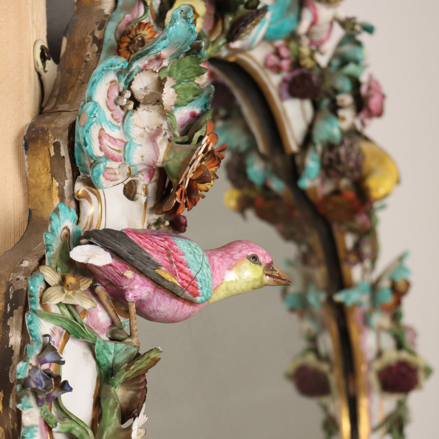 Specchiera in porcellana policroma nei modi di Meissen, Germania fine XIX secolo. Apparato decorativo ricco, composto da fiori ed elementi rocaille entro i quali alloggiano pappagalli e piccoli putti in atteggiamenti differenti. Mancanze, rotture e restauri.